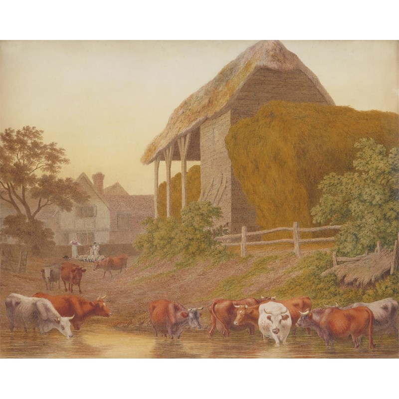 Robert Hills (1769-1844) Cattle watering by a farmstead and hay barn Watercolour 39 x 49cm; 15¼ x...