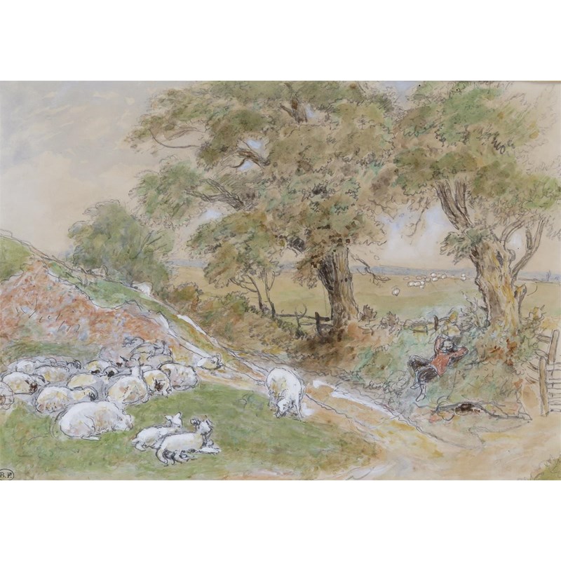 Myles Birket Foster R.W.S. (1825-1899) Sleeping shepherd and sheep in a landscape Studio stamped...