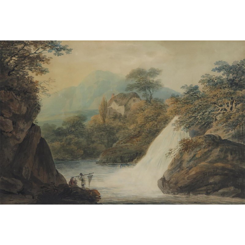 Nicholas Pocock (1740-1821) Fishermen by a waterfall Watercolour 38 x 57cm; 15 x 22½in...