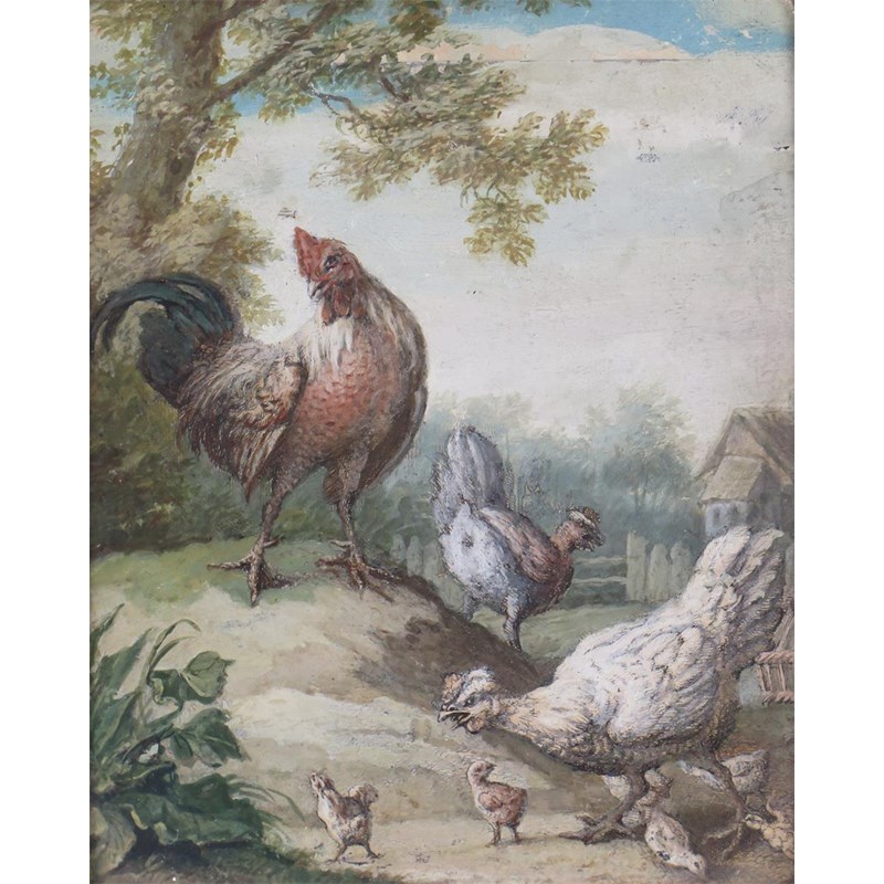 With another similar of chickens in a landscape possibly over a print, framed as a pair (2)