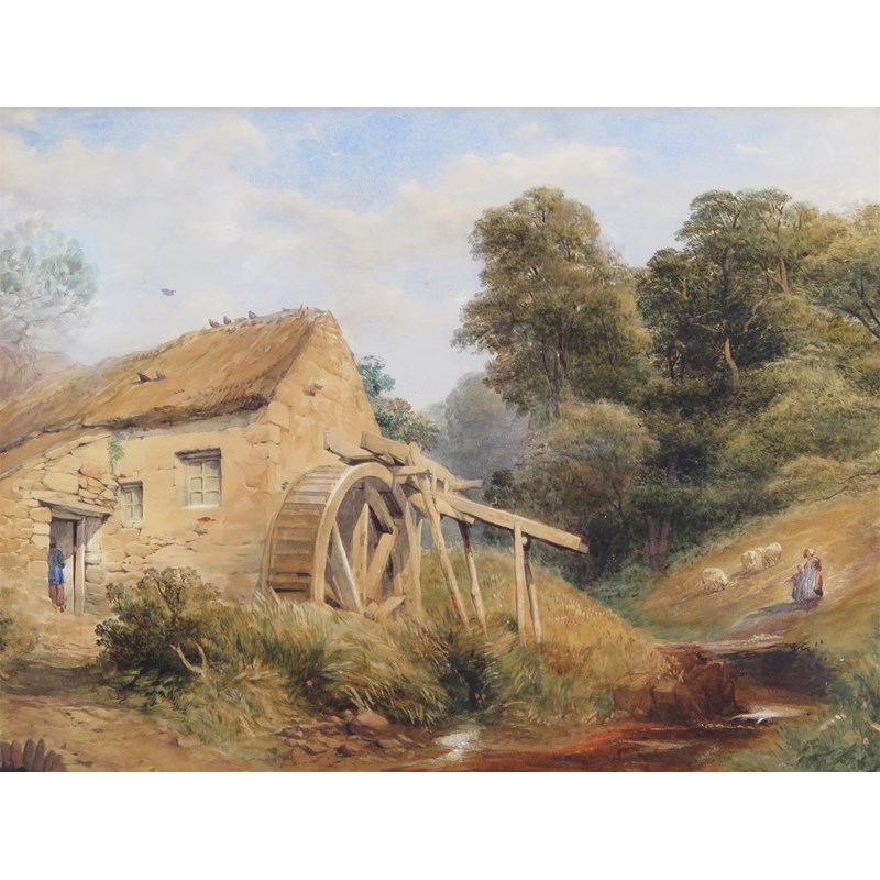 English School 19th Century A mother and daughter by a stream and mill Watercolour 32 x 42cm; 12¼...