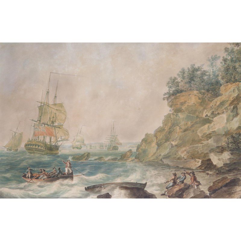 Nicholas Pocock (1740-1821) Shipping off the coast with figures landing on the shore Signed and...