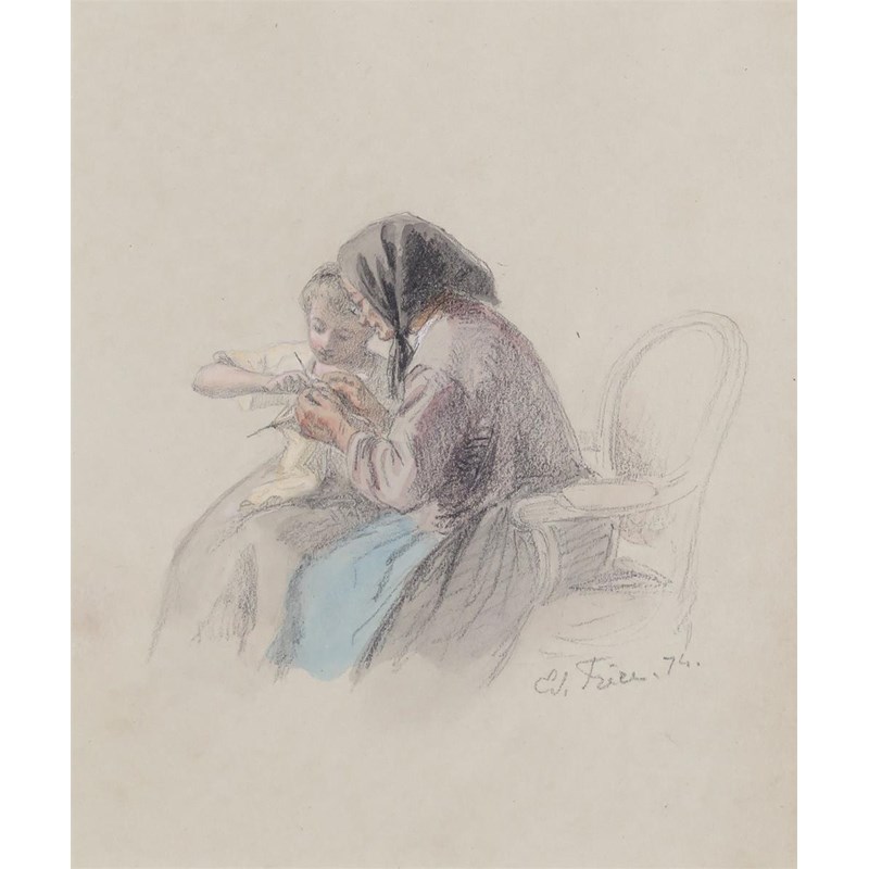 Charles Edouard Frère (French 1837-1894) Tying off the stitch Signed and dated '74 Watercolour...
