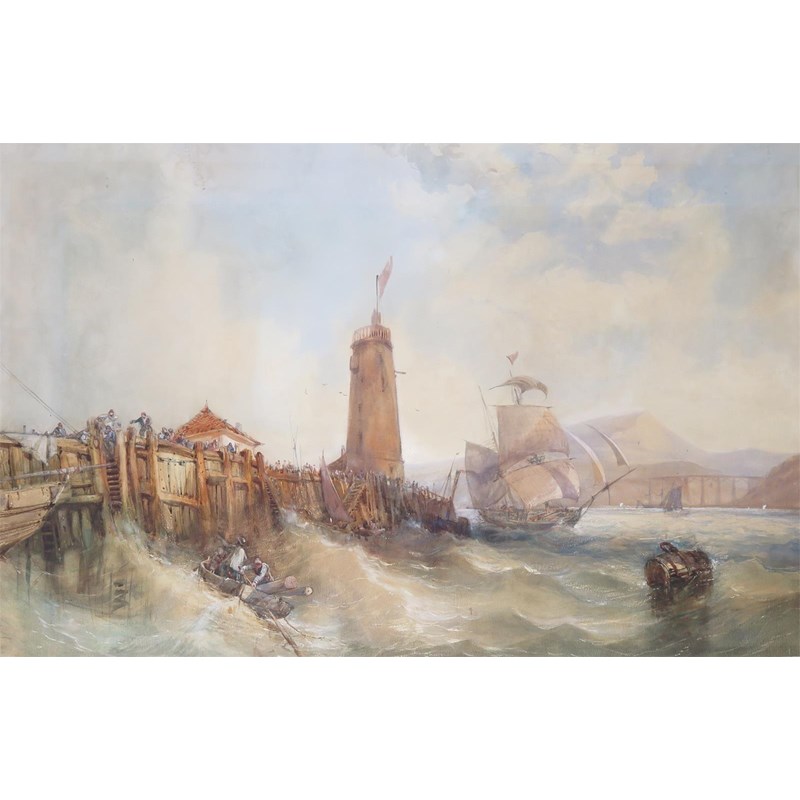 English School late 19th Century Fishing boats by a jetty and lighthouse in a swell Watercolour...