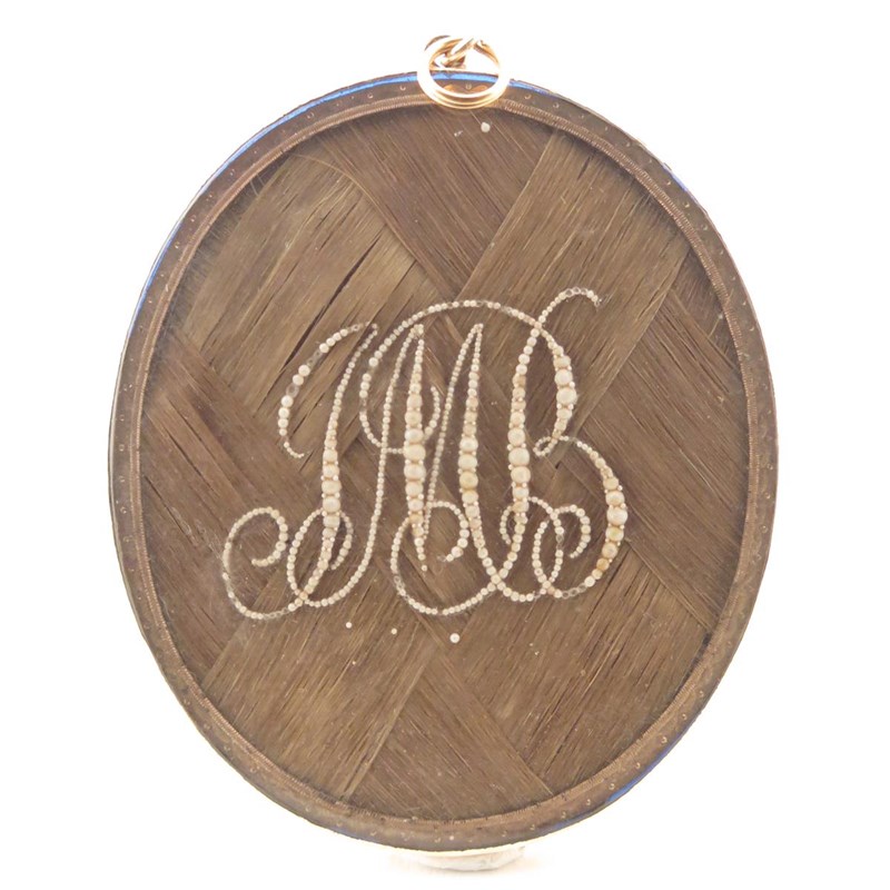 Oval, blue glass surround, gold frame with hair back and seed pearl initials JMB