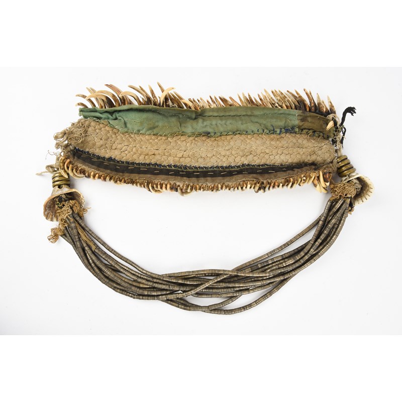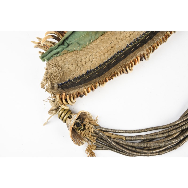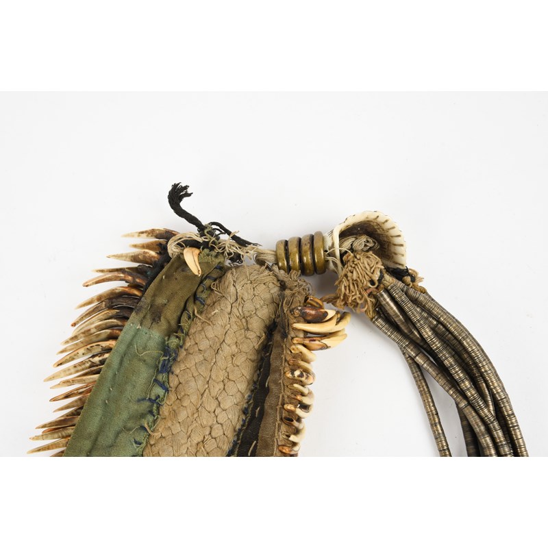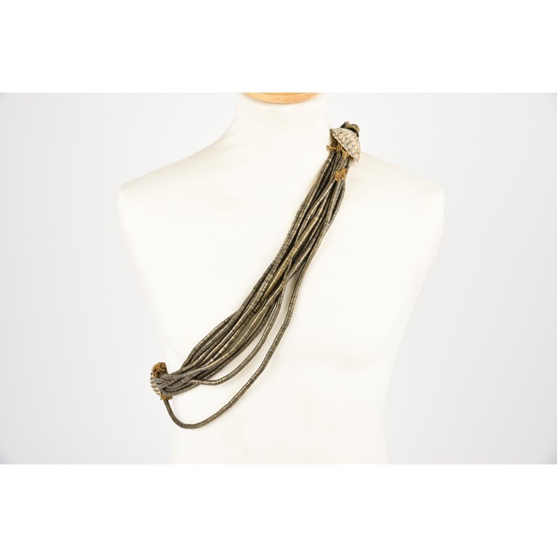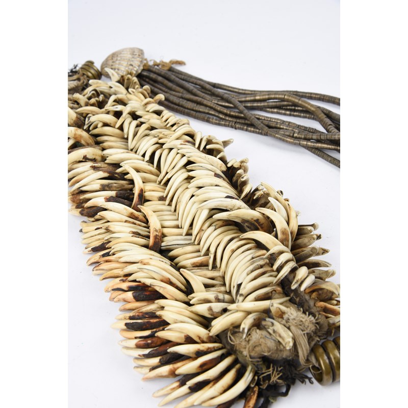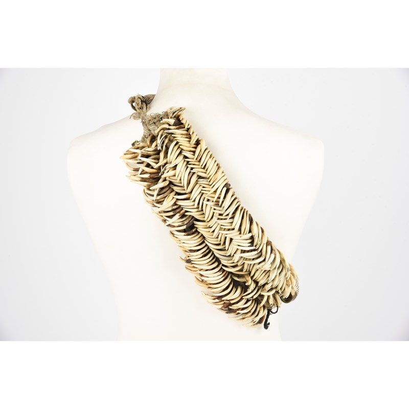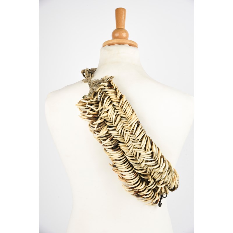 with six rows of pangolin claws manis crassicaudata on a woven fibre and cloth backing, with a metal ring threaded ten strand necklace and with shell and brass coil spacers,