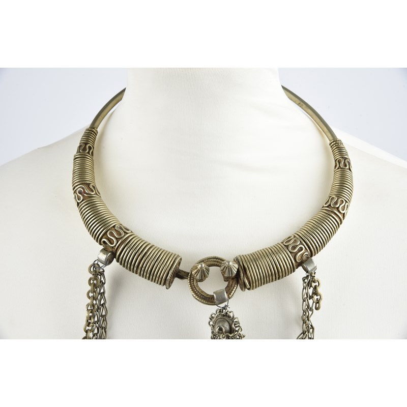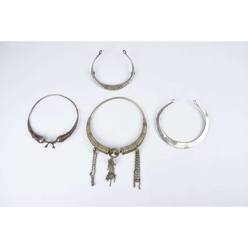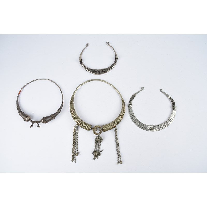 silver coloured metal, including a hanswi with chains, 20cm wide, another with wire and bead decoration, 18cm wide, and two with applied florets and incised decoration, 15.2cm and 18cm wide. (4)