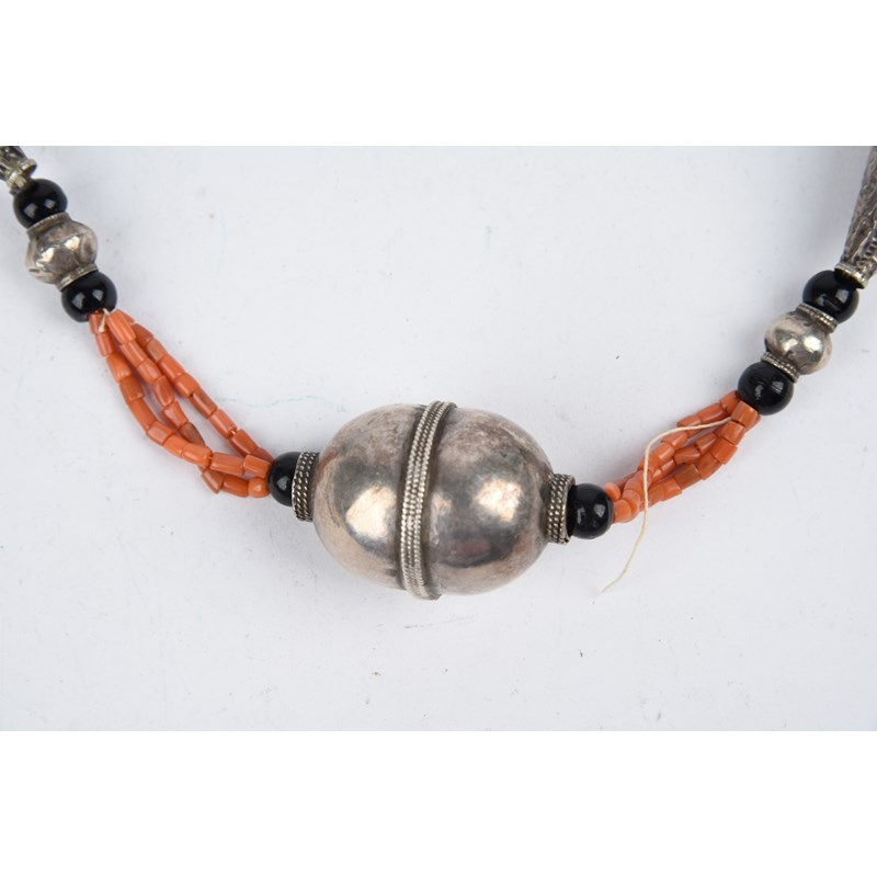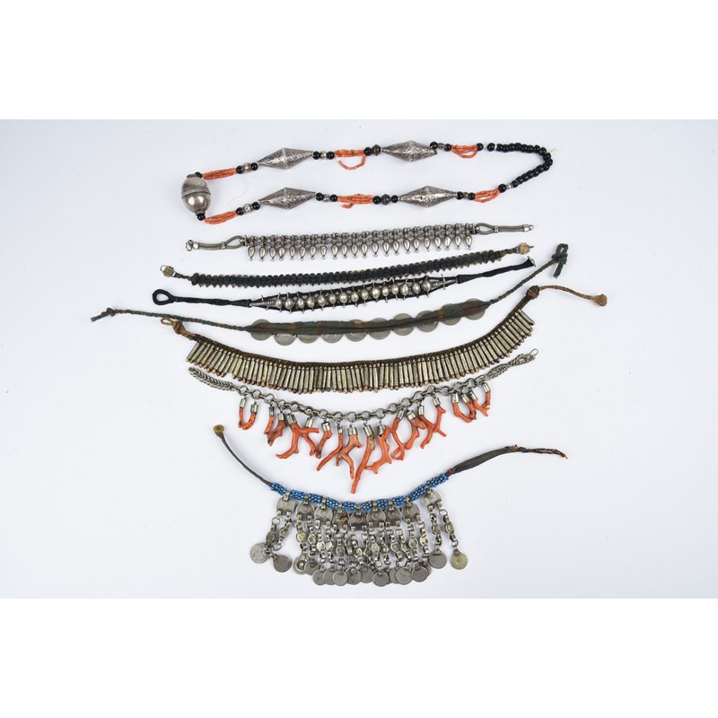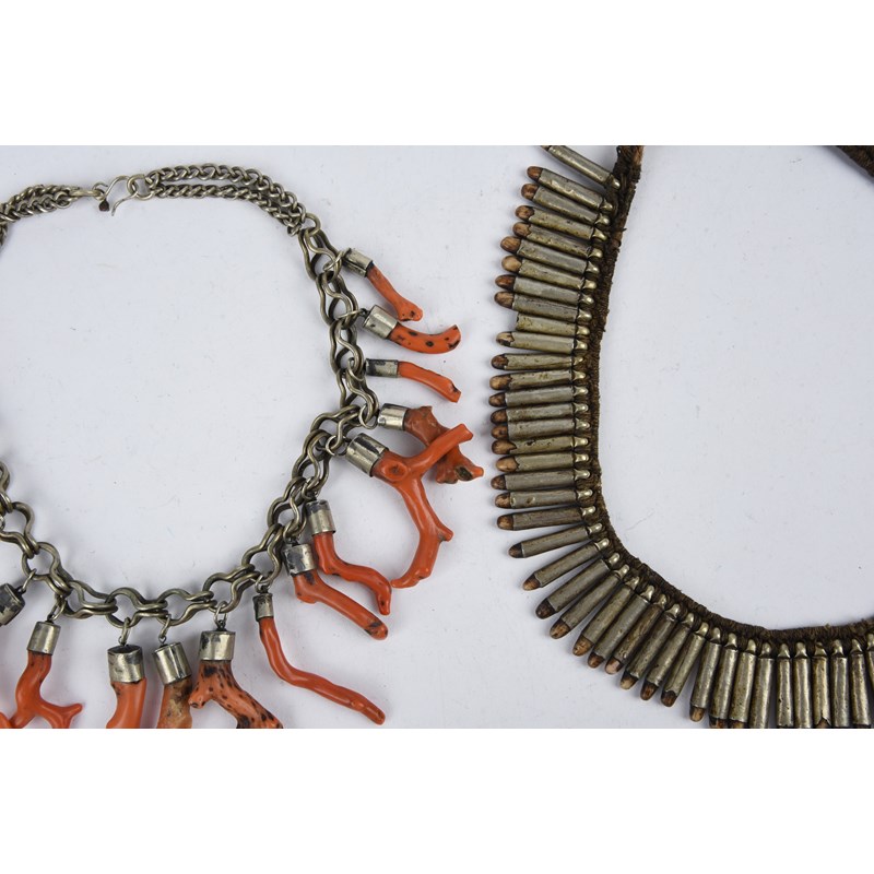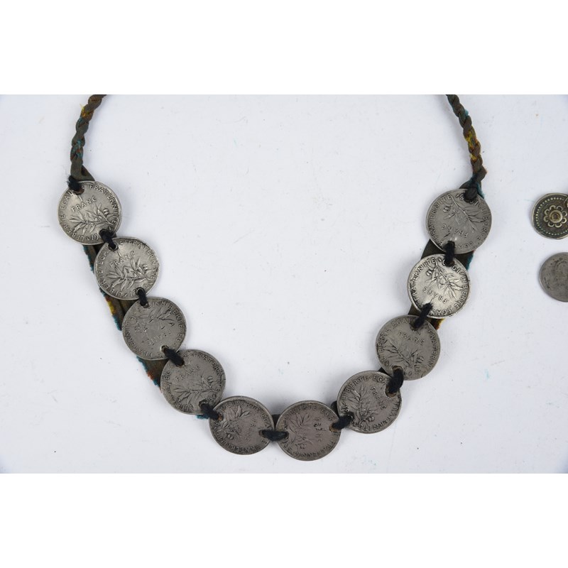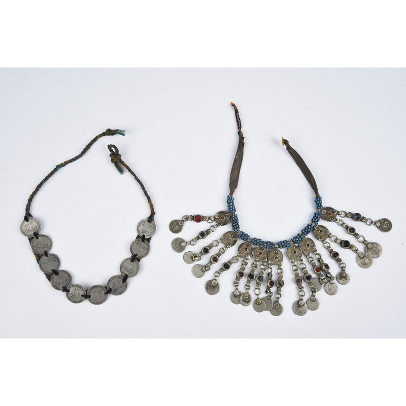 coral, silver coloured metal, glass beads, bone and coins, including Francs and Rupee's,
