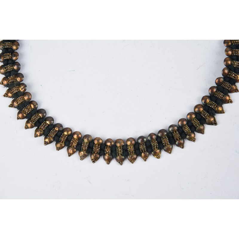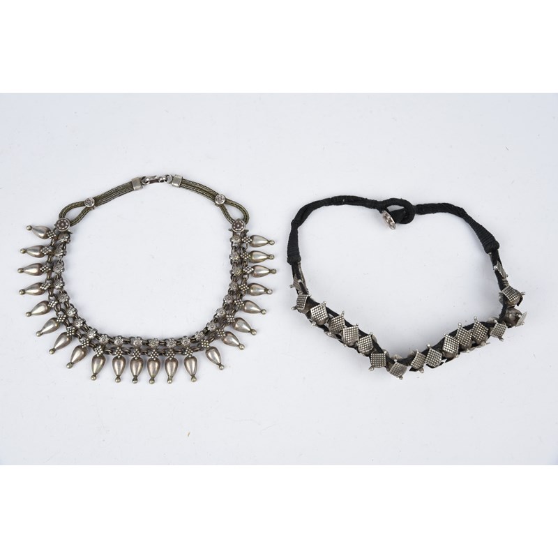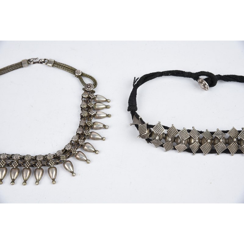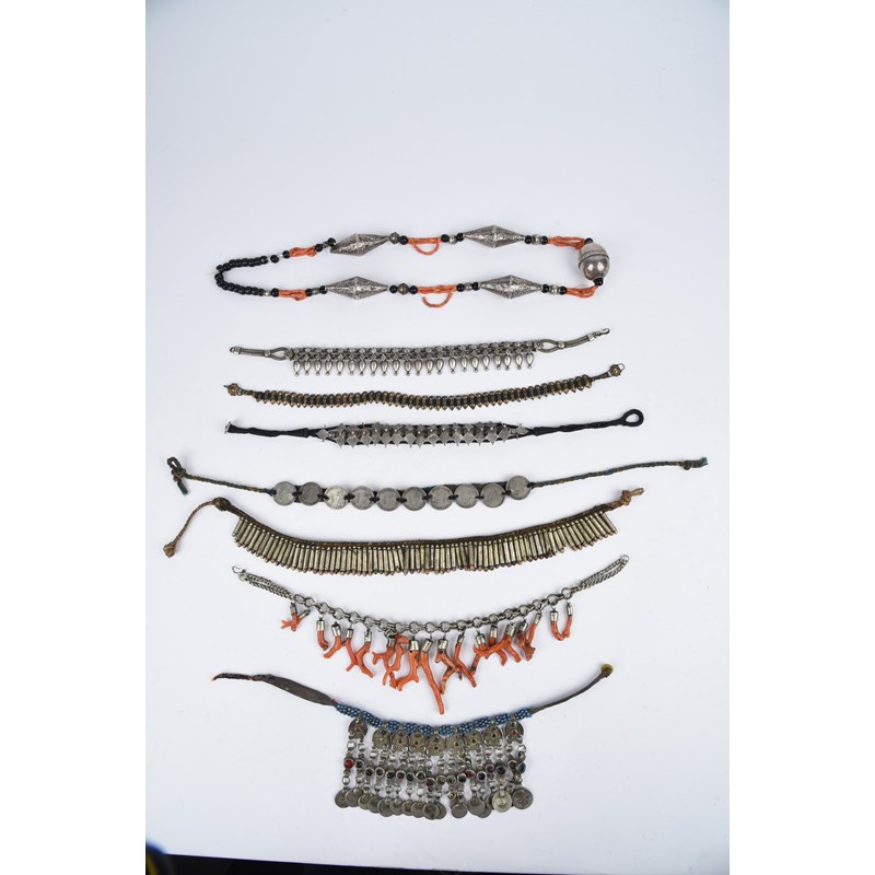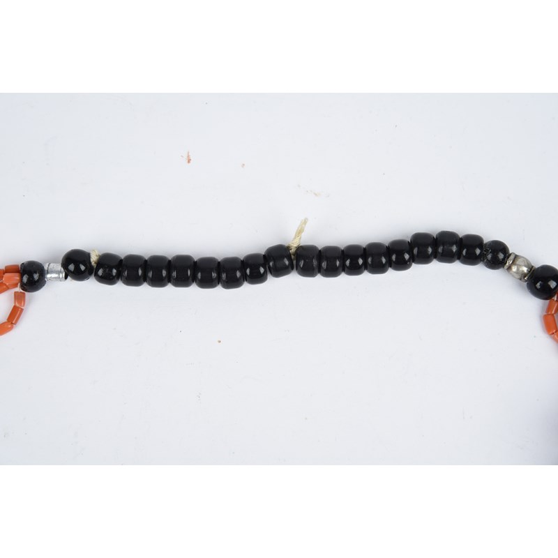 coral, silver coloured metal, glass beads, bone and coins, including Francs and Rupee's,