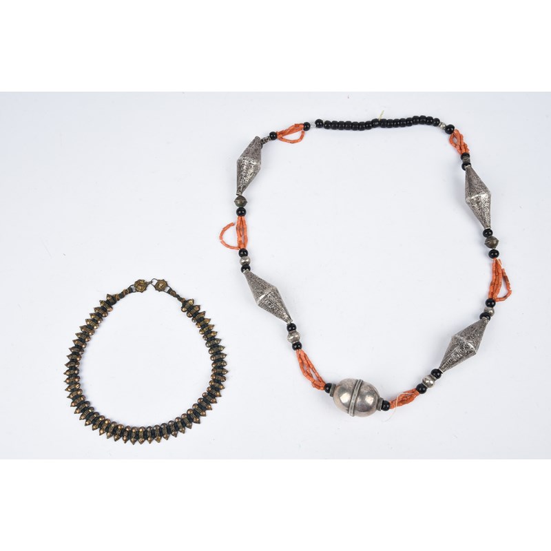 and a coral bead and silver coloured metal bead necklace with glass and brass beads. (8)
