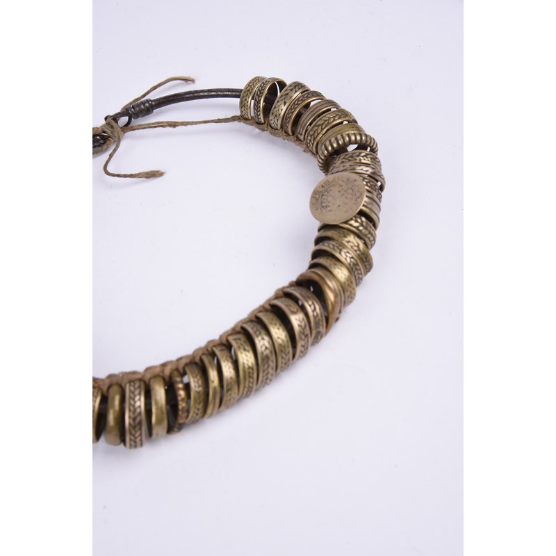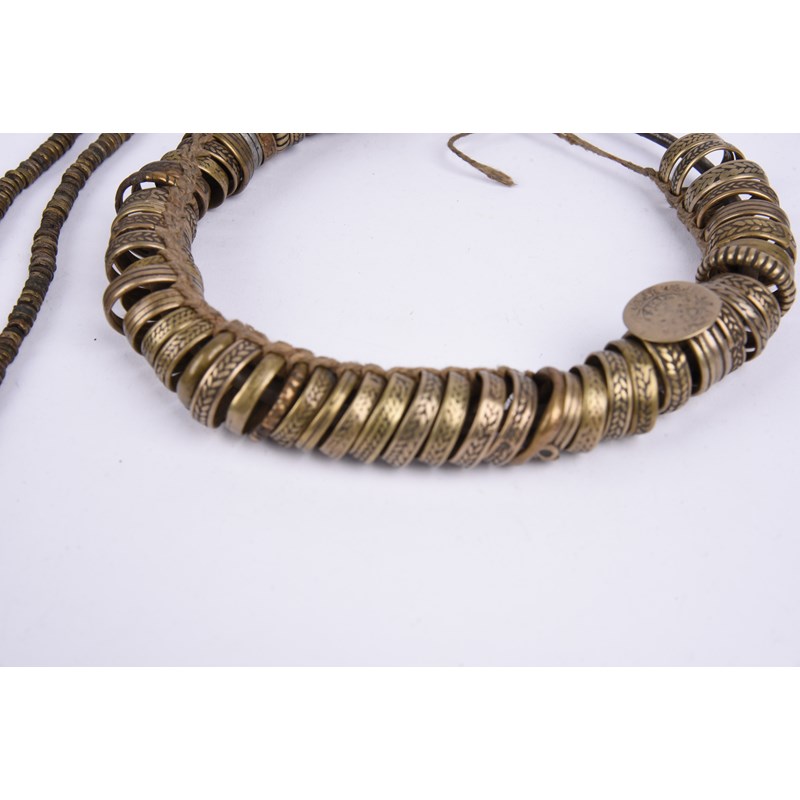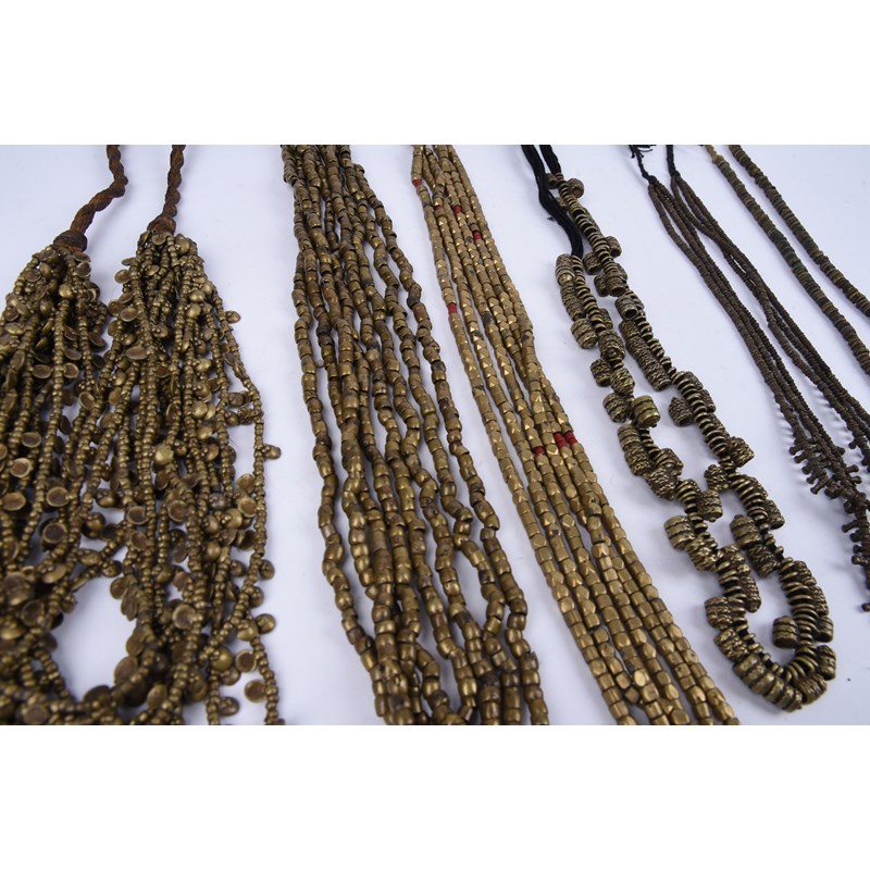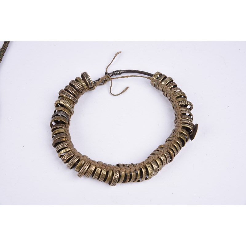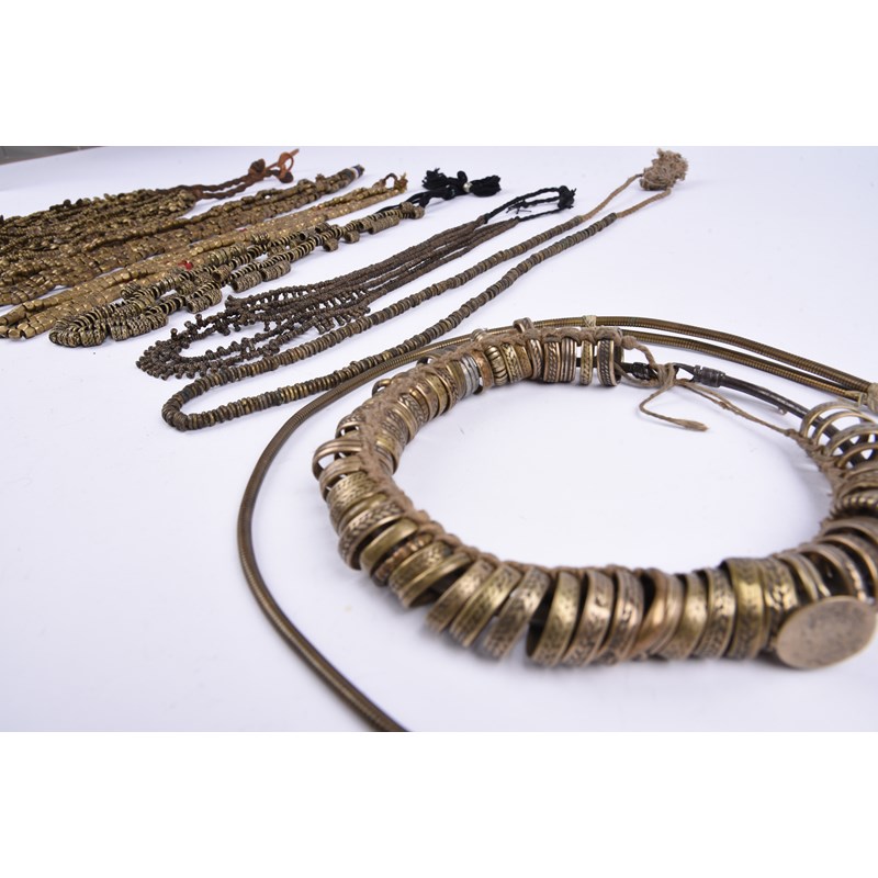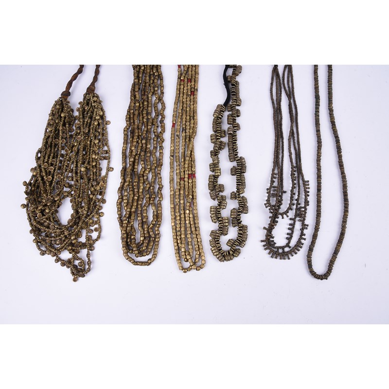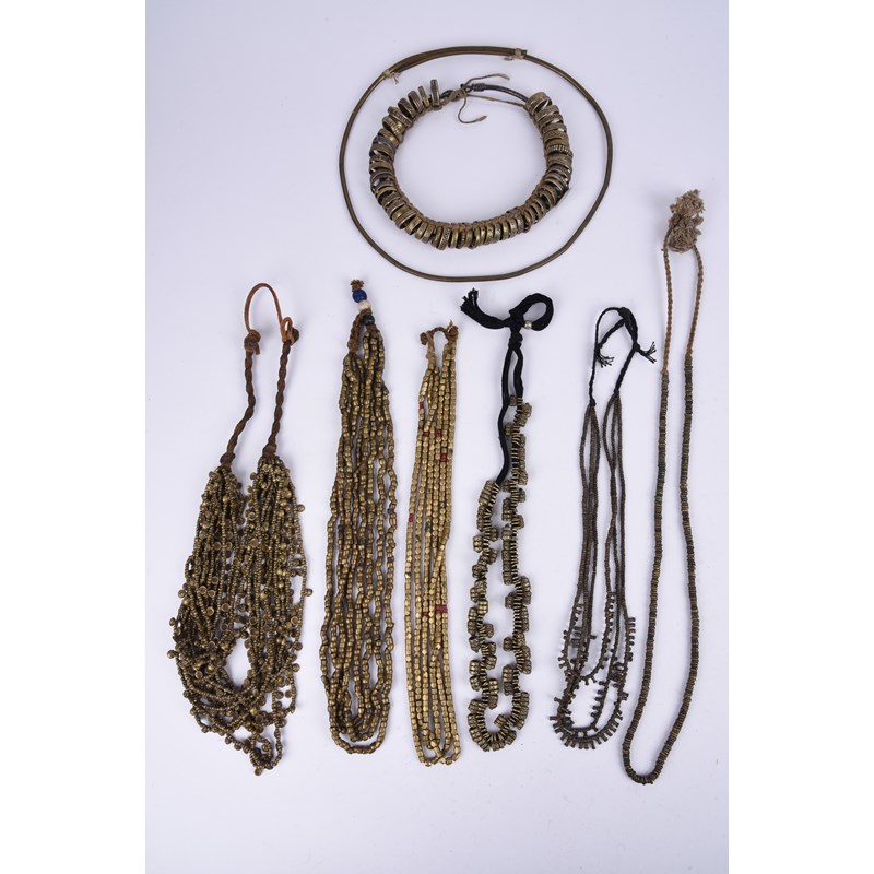 including a single, a triple and a quadruple bead type, two with glass beads; a coiled wire; three pendant bead types, single, triple and twelve strands, and an iron torque with fifty four brass and one white metal rings,