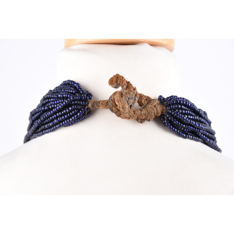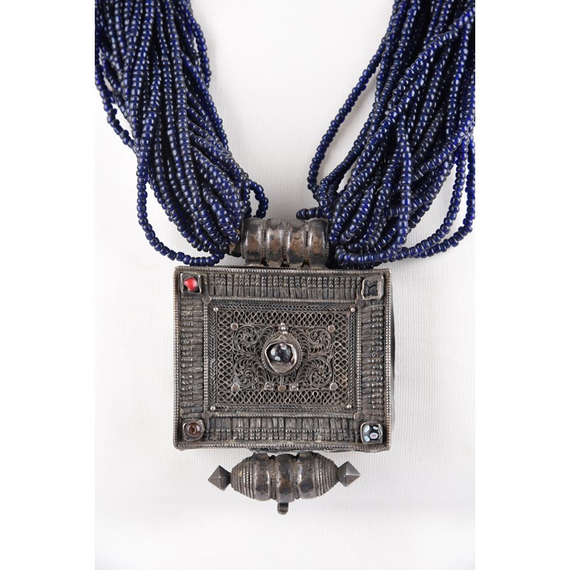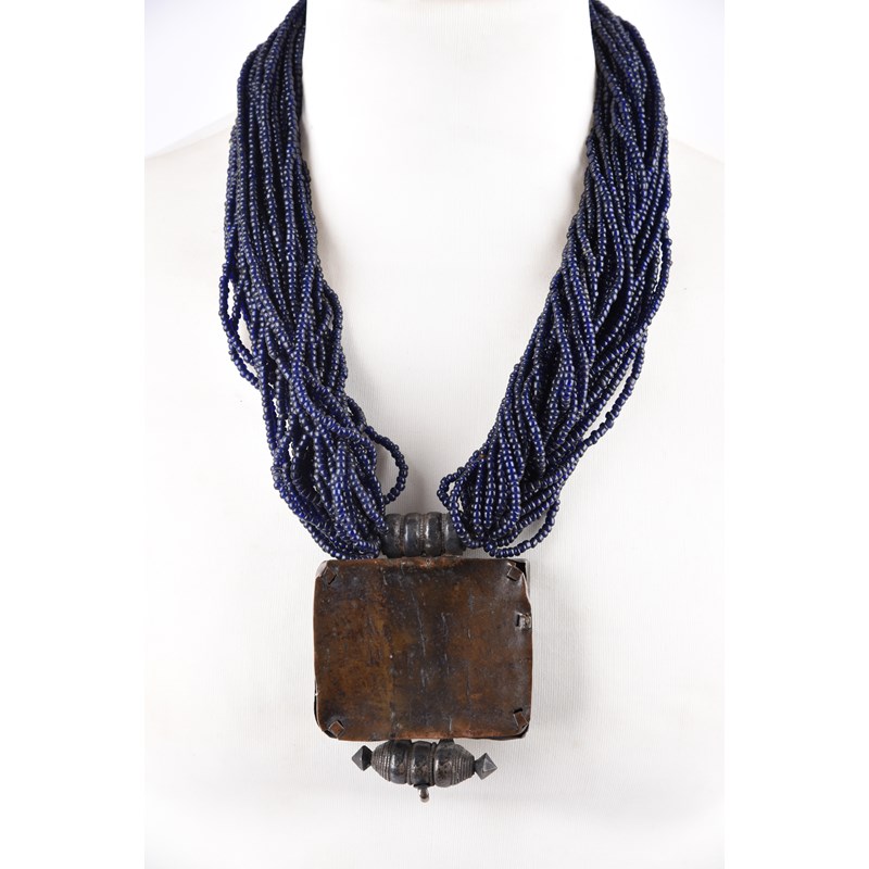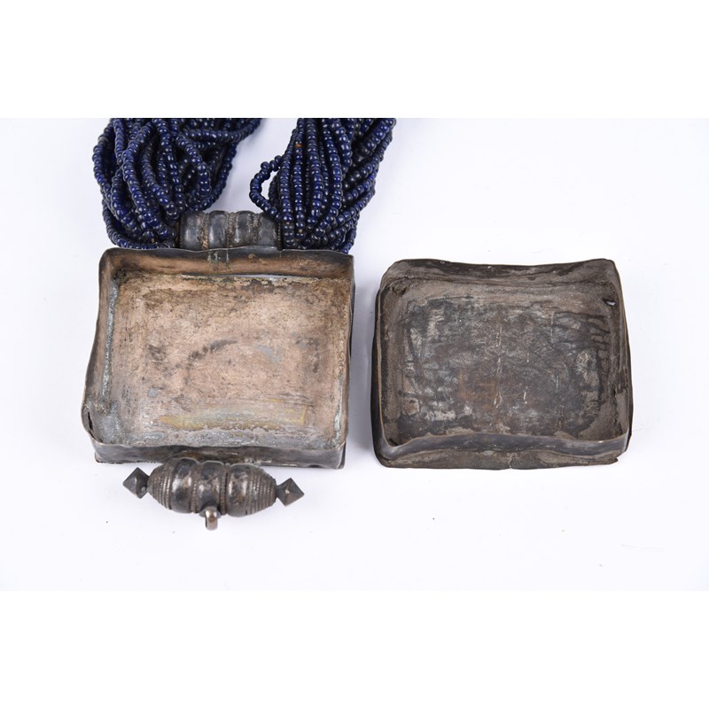 the copper and silver coloured metal box with filigree and inset glass beads, with a blue glass bead multi strand necklace,