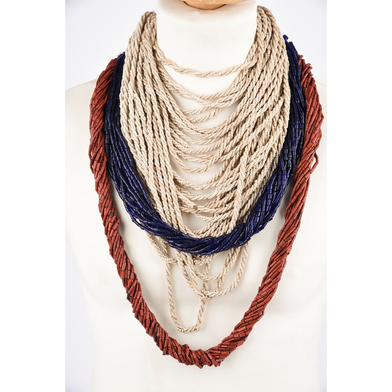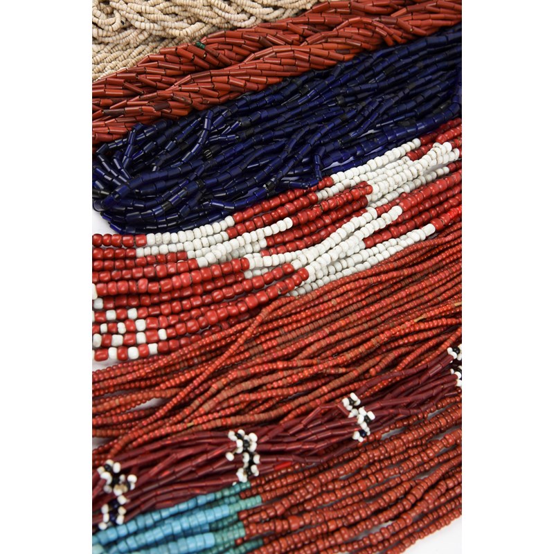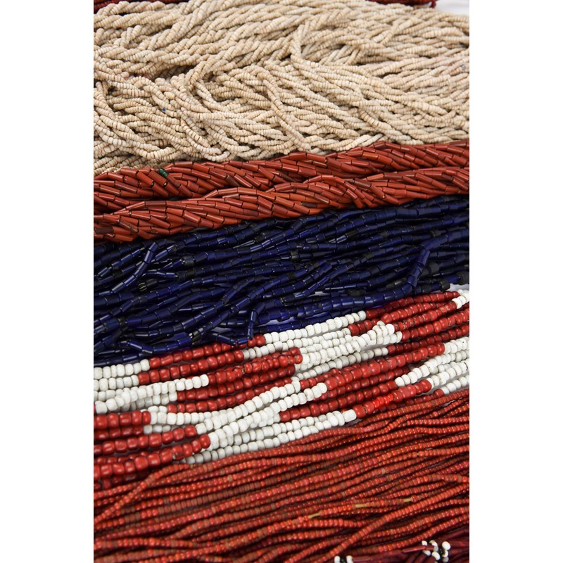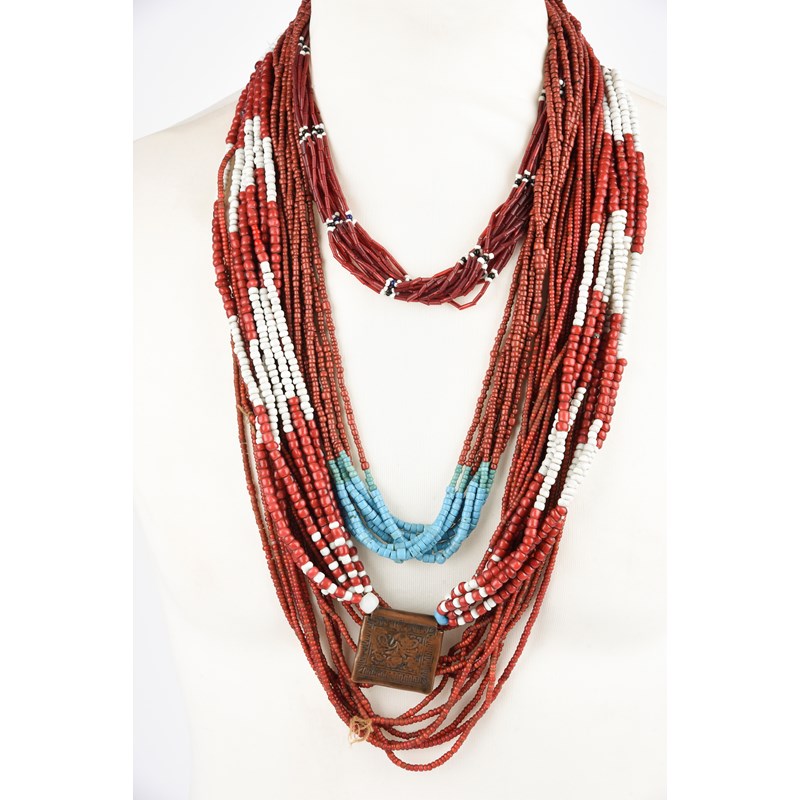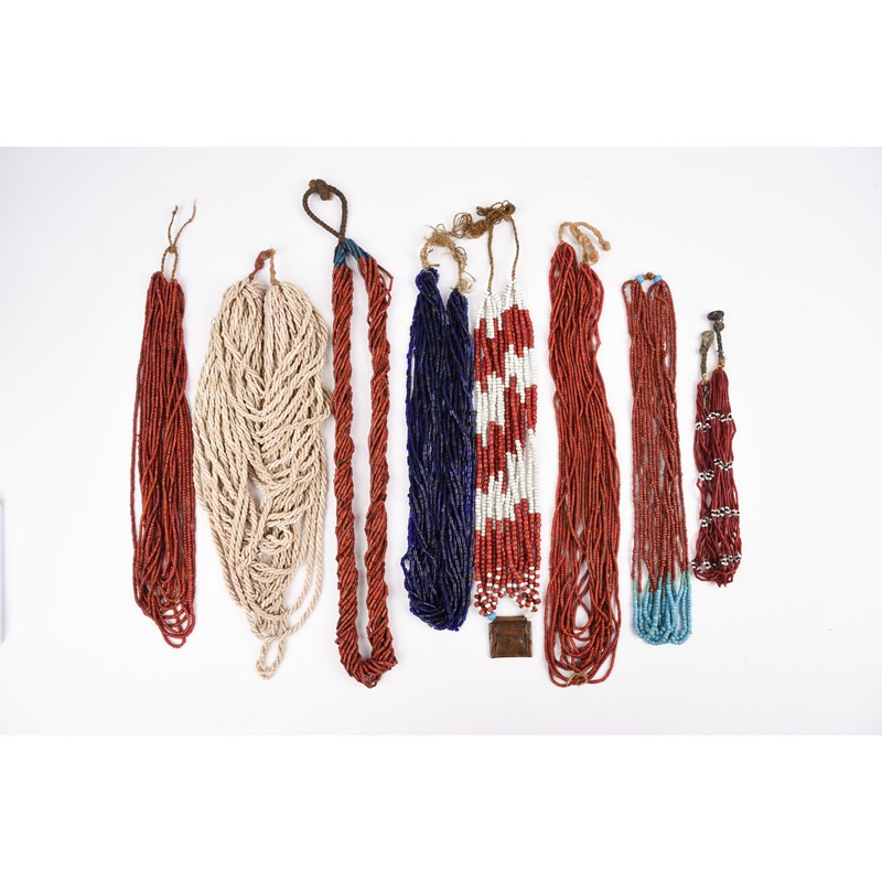 coloured glass beads, one with a button clasp and another with an embossed brass pendant,