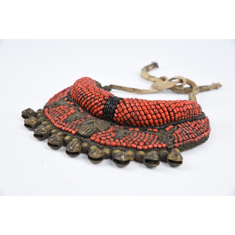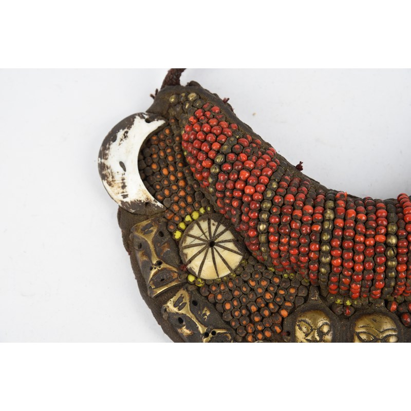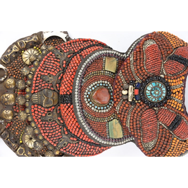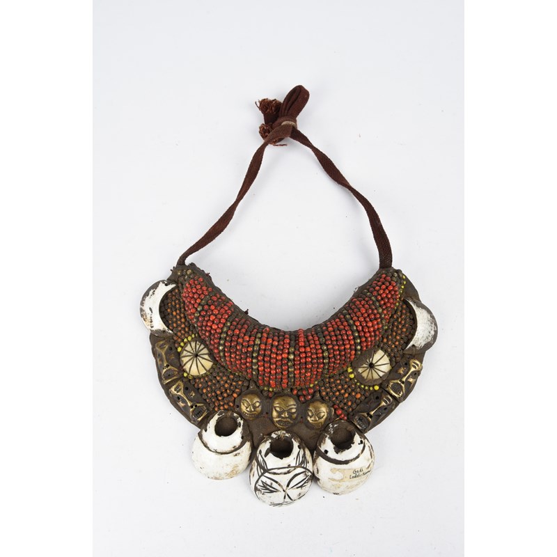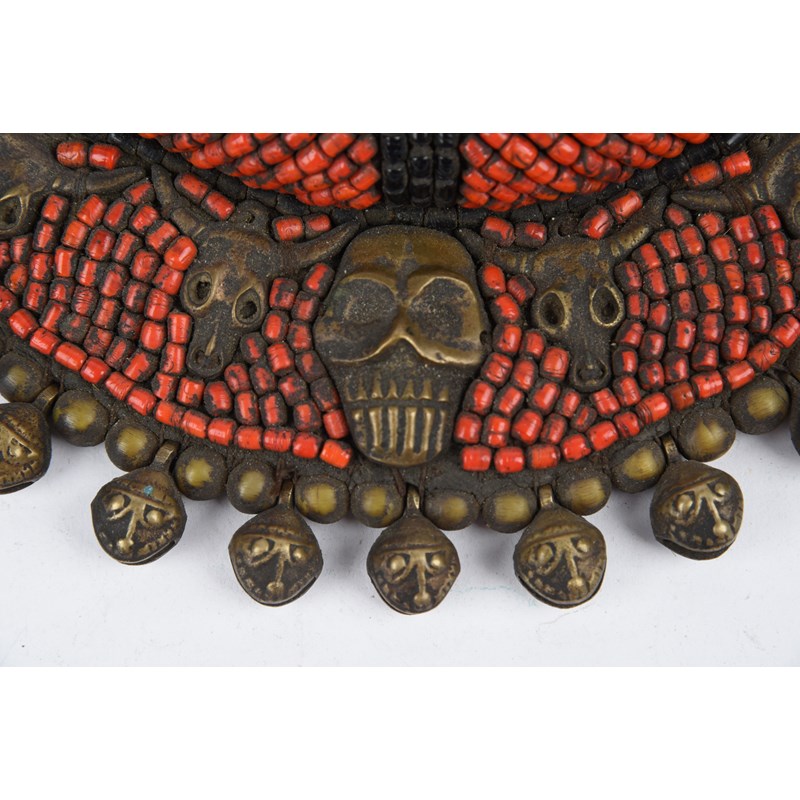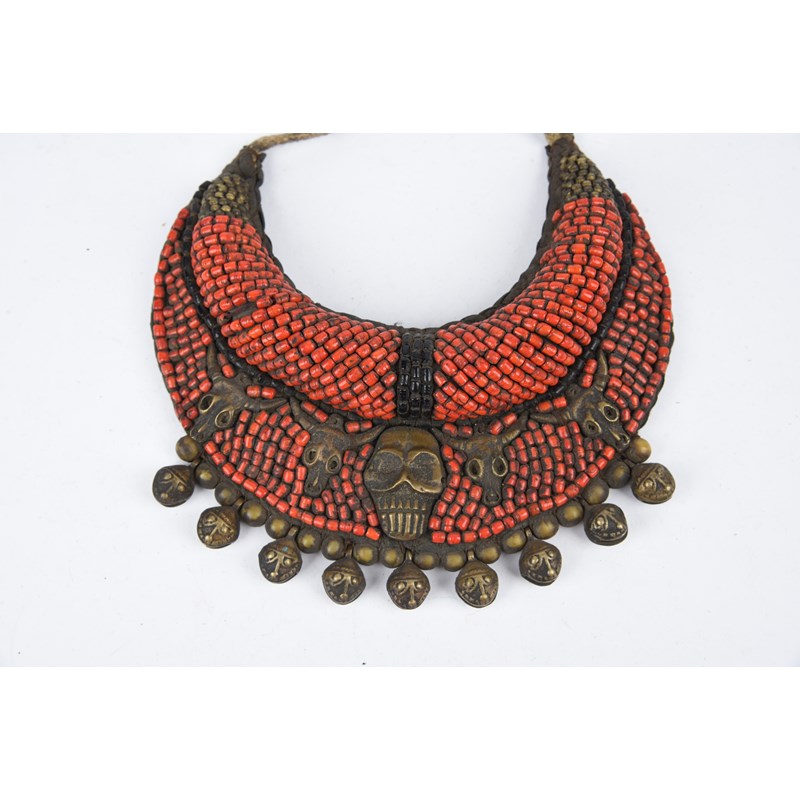 coloured glass beads, turquoise, bone, brass and silver coloured metal beads, shells and brass masks, skulls and bells,