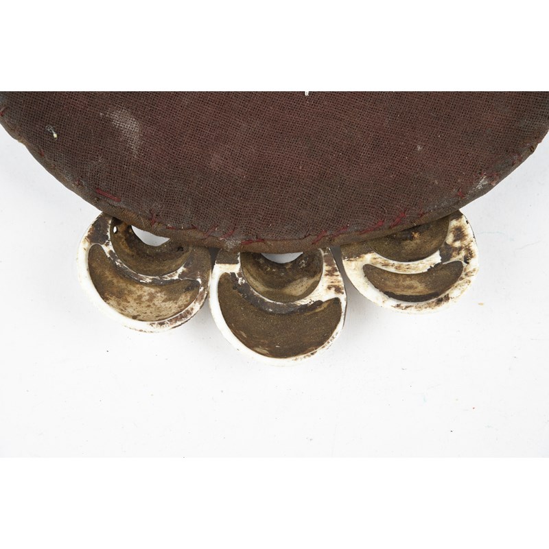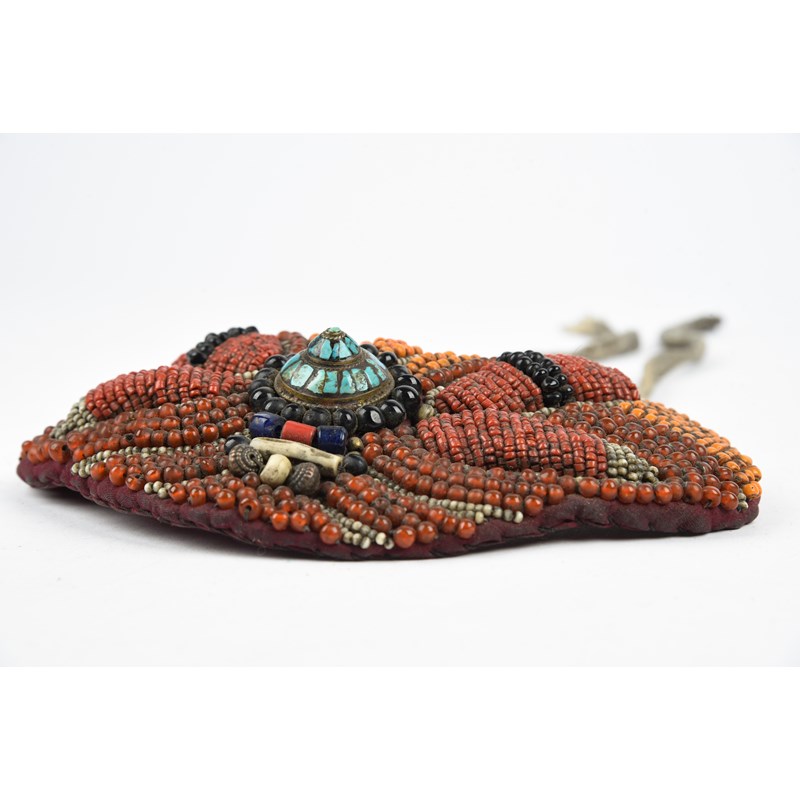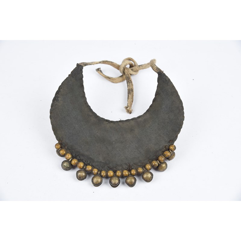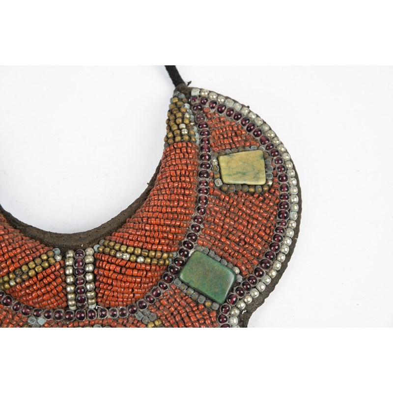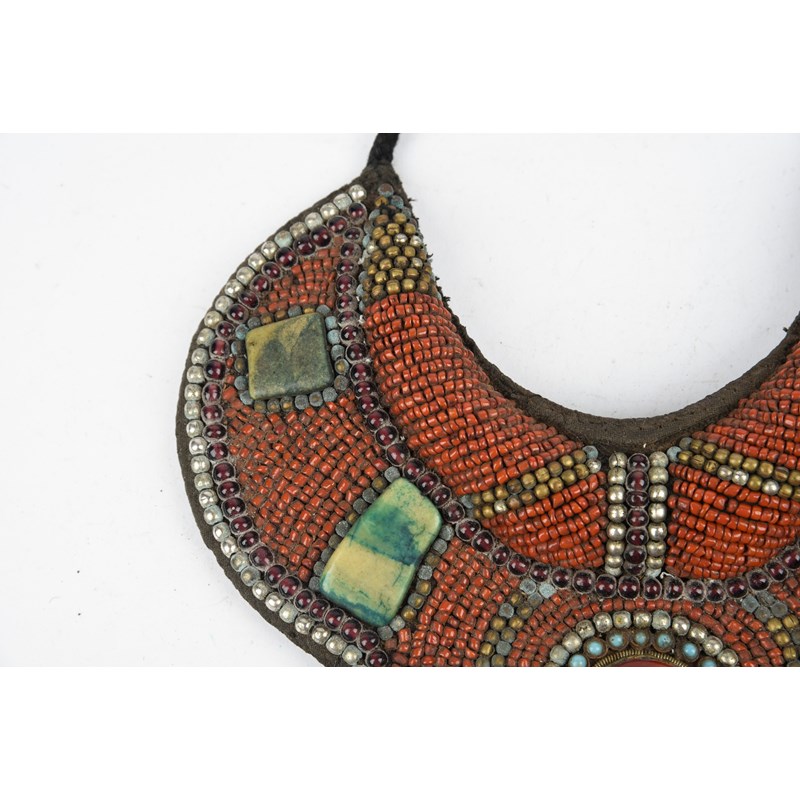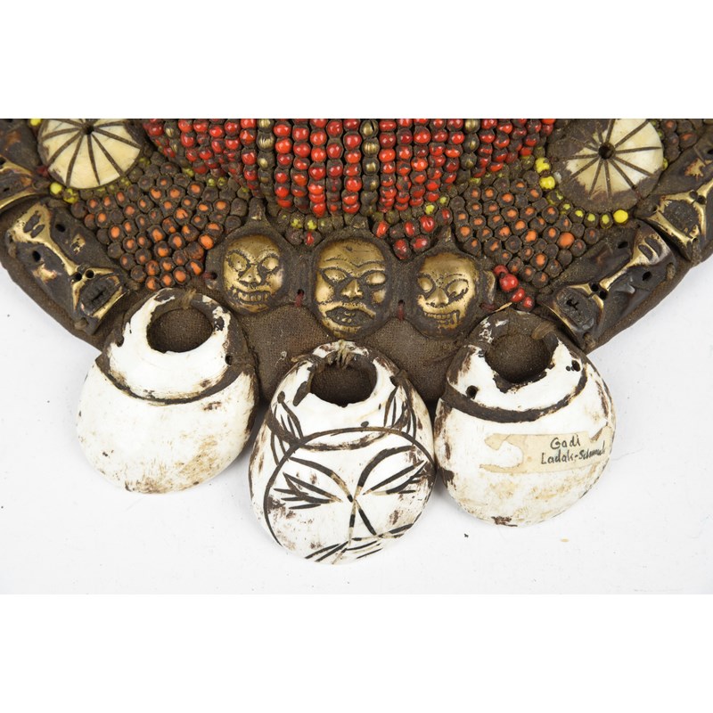 coloured glass beads, turquoise, bone, brass and silver coloured metal beads, shells and brass masks, skulls and bells,