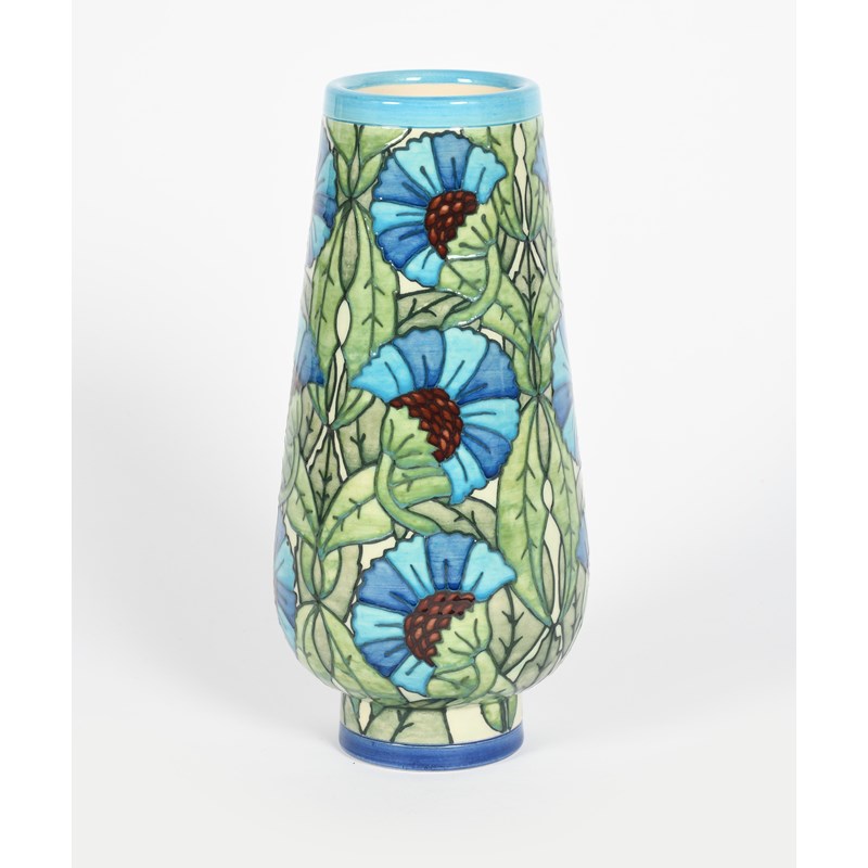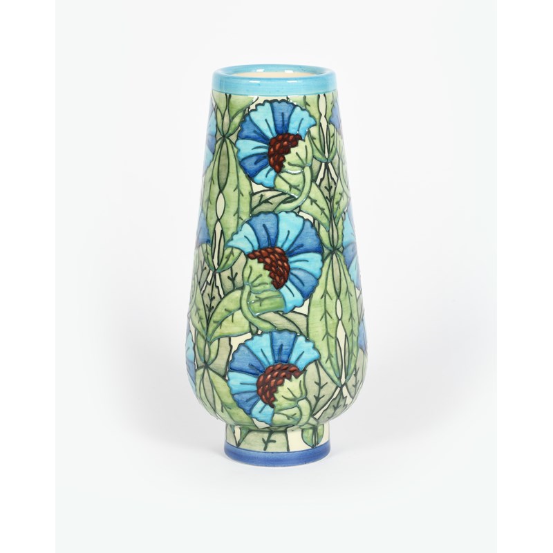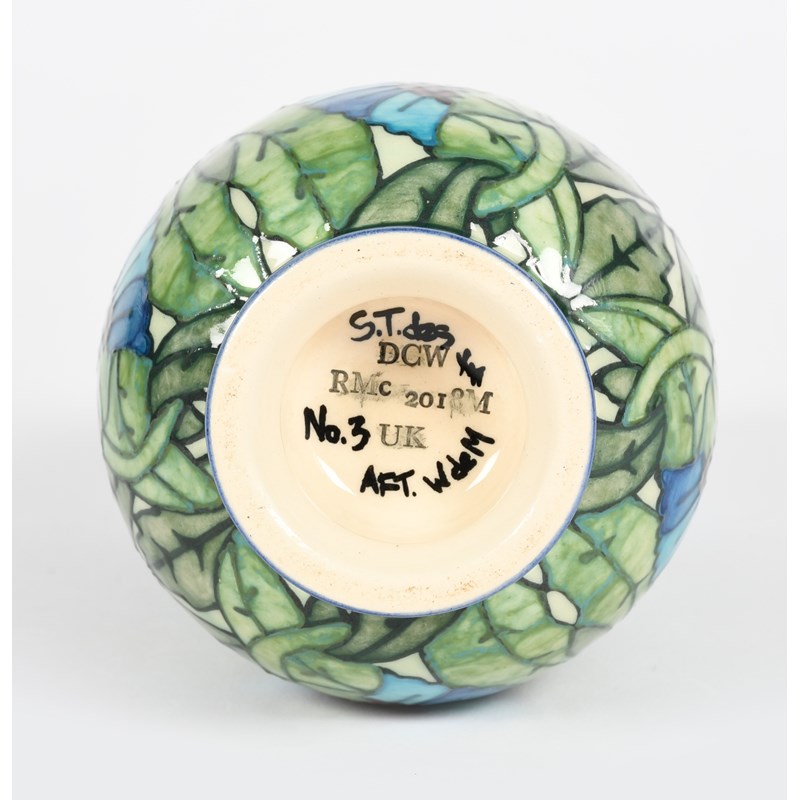 'BBB' a Dennis China Works limited edition Bud vase designed by Sally Tuffin, dated 2018, painted by Vanessa Thompson, thrown by Rory McLeod, footed, swollen cylindrical form, tubeline decorated in blue, turquoise and green after the original BBB tile design by William De Morgan, impressed and painted marks, numbered 3, 21cm. high
