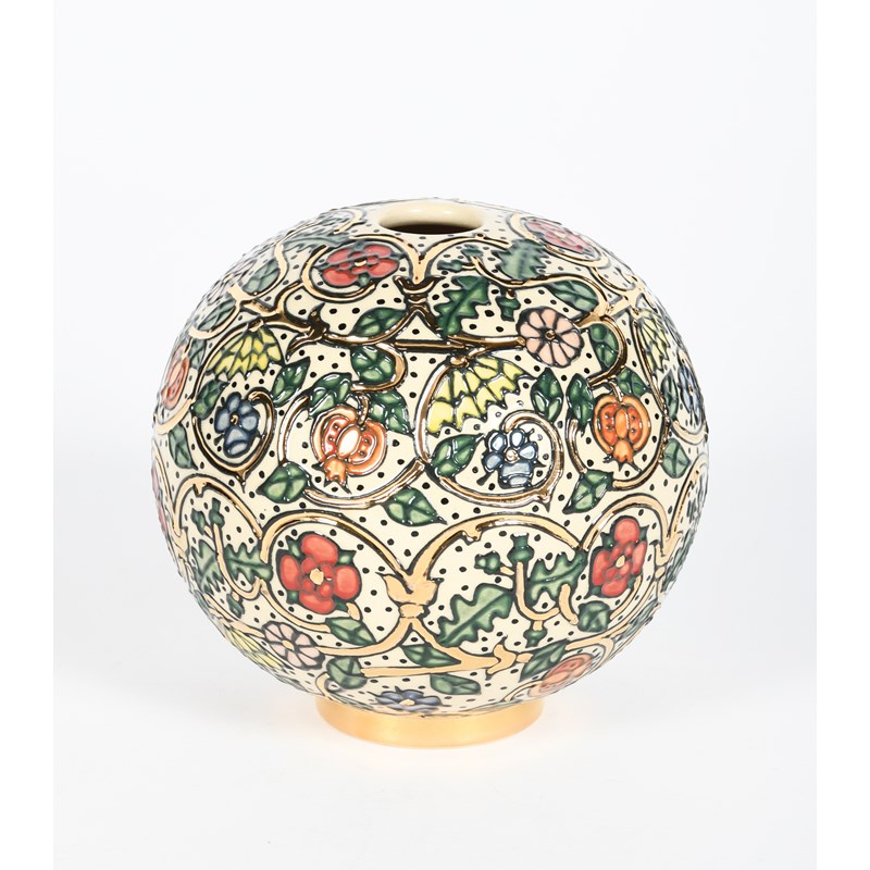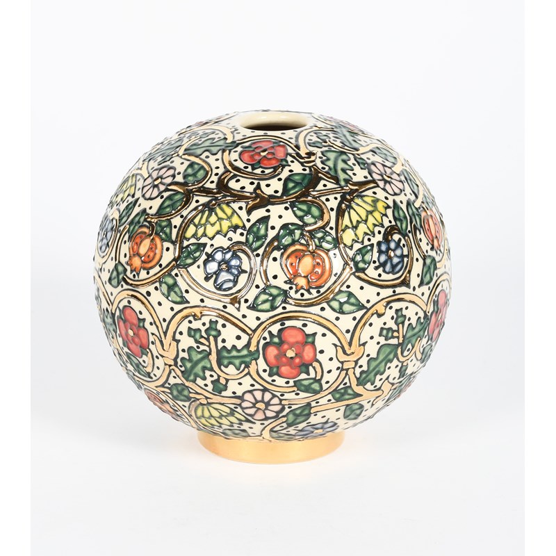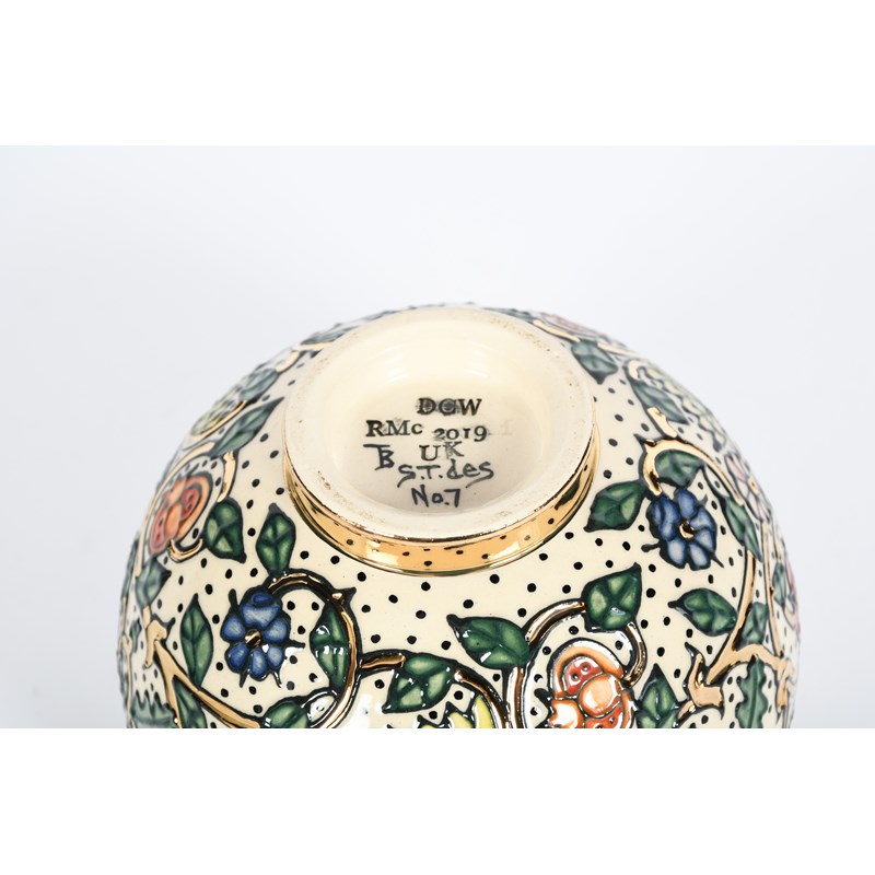 'Elizabethan Embroidery' a Dennis China Works limited edition Sphere vase designed by Sally Tuffin, dated 2019, painted by Theresa Blackmore, thrown by Rory McLeod, tubeline decorated in colours and gilt based on an embroidered Elizabethan jacket in the V&A museum, impressed and painted marks, numbered 7, 11.5cm. high