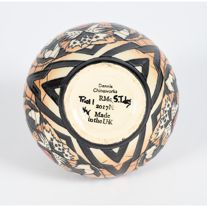 'Tiger' a Dennis China Works trial Mr T vase designed by Sally Tuffin, dated 2017, painted by Vanessa Thompson, thrown by Rory McLeod, painted in shades of orange, black and cream, impressed and painted marks, marked Trial, 12.5cm. high