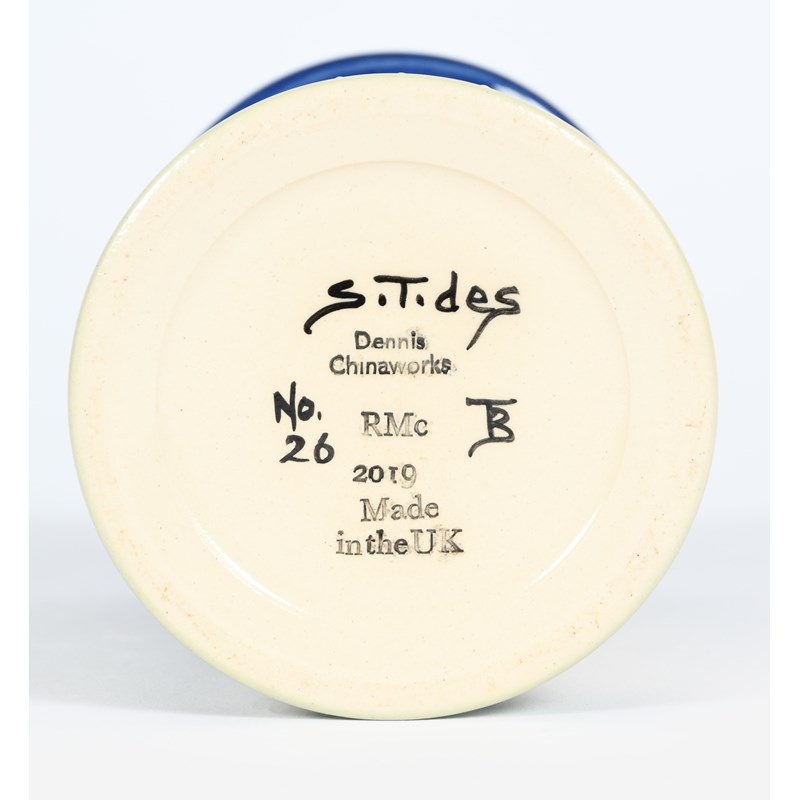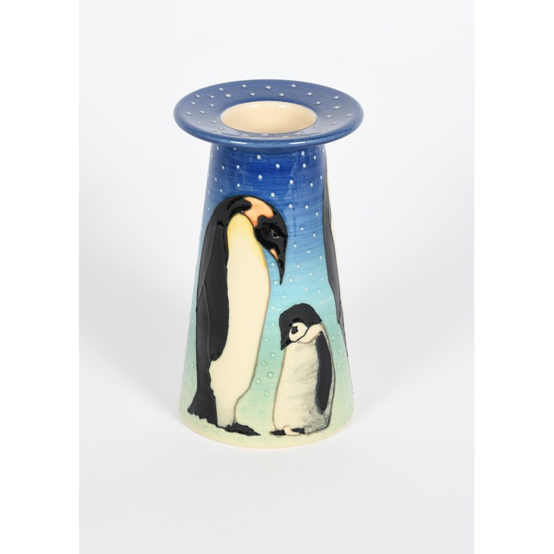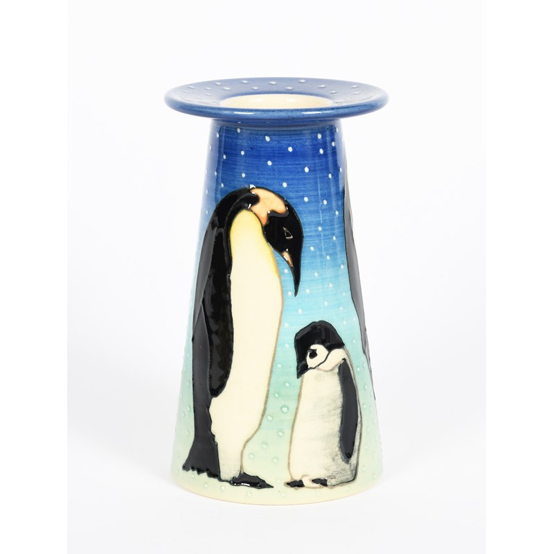 'Penguins' a Dennis China Works limited edition Conical vase designed by Sally Tuffin, dated 2019, painted by Theresa Blackmore, thrown by Rory McLeod, tubeline decorated in colours on a graduated blue ground, impressed and painted marks, numbered 26, 18cm. high