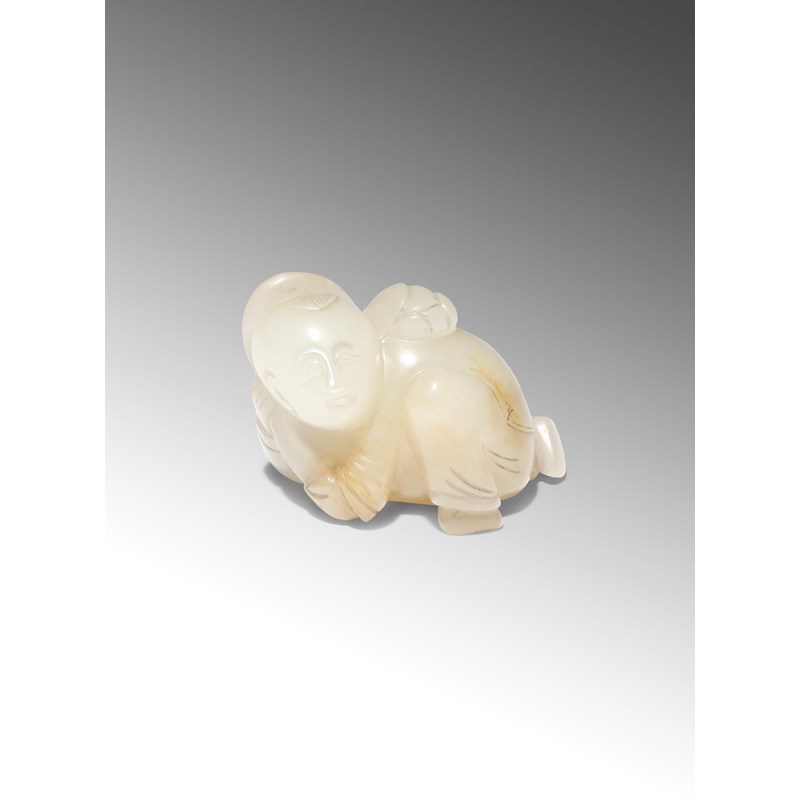 A SMALL CHINESE PALE CELADON JADE CARVING OF A BOY WITH LOTUS