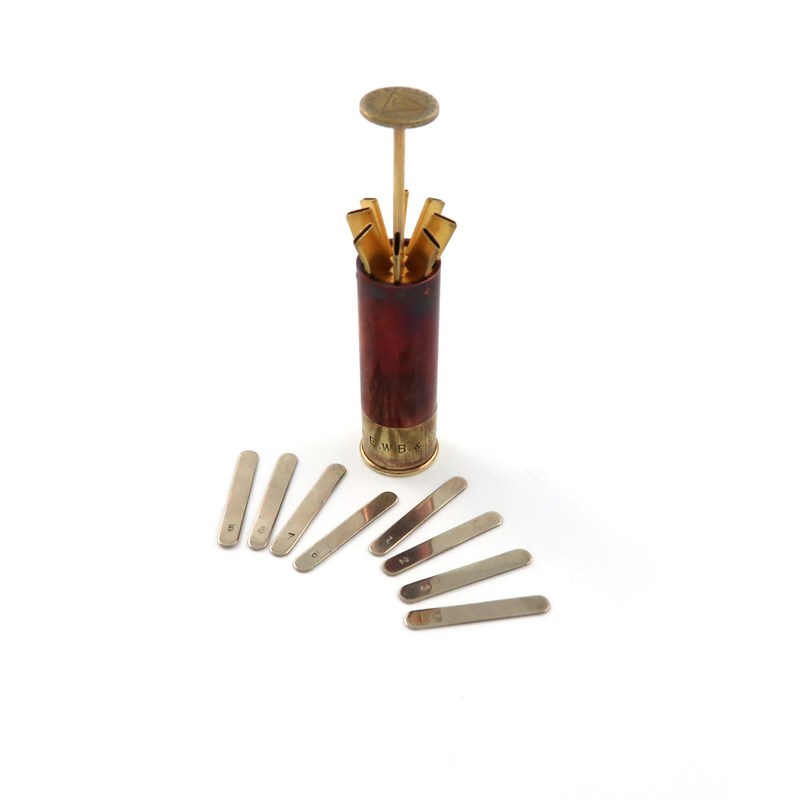 the base inscribed 'Asprey's Cartridge Place Finder, Patent Applied For' the top with a 6 in a triangle and inscribed, 'Loaded by Asprey, Smokeless', the rotating action opens the cartridge to reveal eight unmarked numbered pegs, the base with a presentation inscription, length closed 6.2cm.