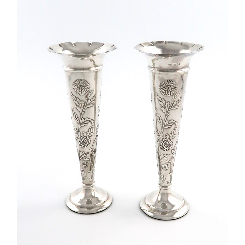 tapering circular form, crimped borders, embossed with chrysanthemum decoration, on raised weighted circular bases, height 20.7cm. (2)