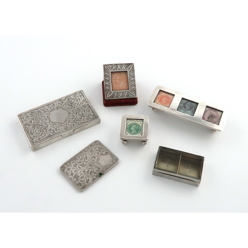 comprising: a late-Victorian triple box, by A and J Zimmerman, Birmingham 1899, rectangular form, the hinged cover set with three stamps under glass, length 8.8cm, plus two single stamp boxes, a double box with a hinged glass cover, by Saunders and Shepherd, Chester 1898, a double slide-action case, with engraved decoration, and an Edwardian box, the hinged cover set with two stamp compartments, Birmingham 1901. (6)