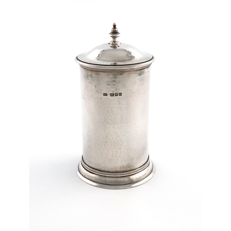 upright cylindrical form, spot-hammered decoration, the pull-off cover with a knop finial, on a spread circular base, green glass liners, approx. weight 15.6oz., 17cm high
