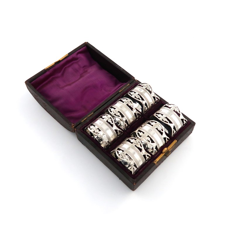 circular form, pierced and engraved with foliate decoration, reeded borders, numbered 1-6, in a fitted case, approx. weight 5oz. (6)