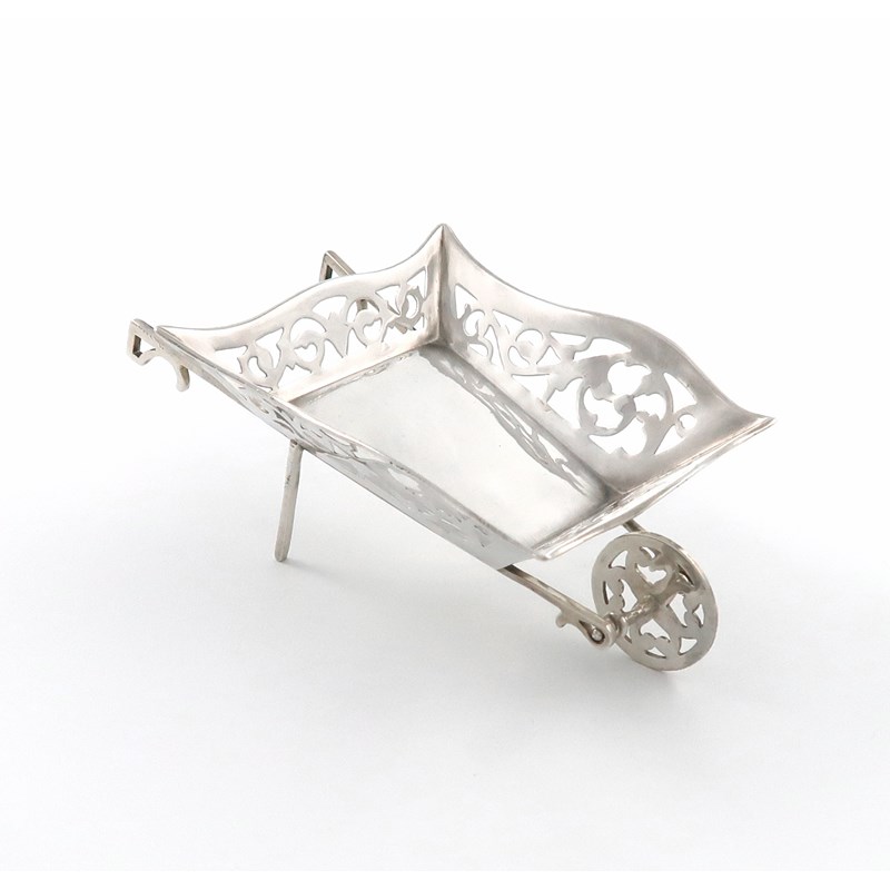 modelled as a wheelbarrow, the sides pierced with foliate scroll decoration, length 12.3cm, approx. weight 1.2oz.