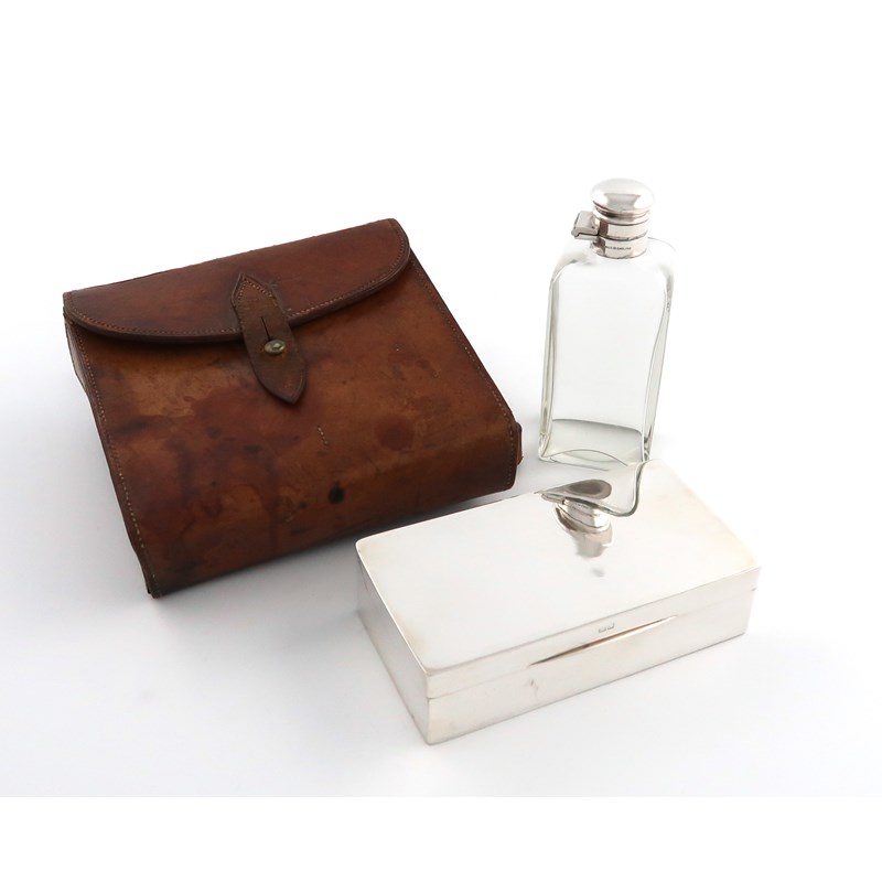 rectangular form, hinged cover and side, gilded interior, the flask with a bayonet fitting hinged cover, plain glass body, retailed by Swaine and Brigg, London, in a fitted leather case, initialled 'E.R.C', length of box 13.5cm, approx. weighable 7oz.