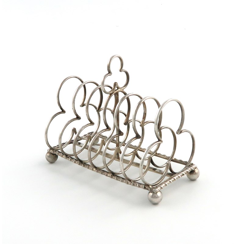 trefoil shaped bars, with a central carrying handle, on a rectangular base with a gadroon border, on four ball feet, length 14cm, approx. weight 5.7oz.