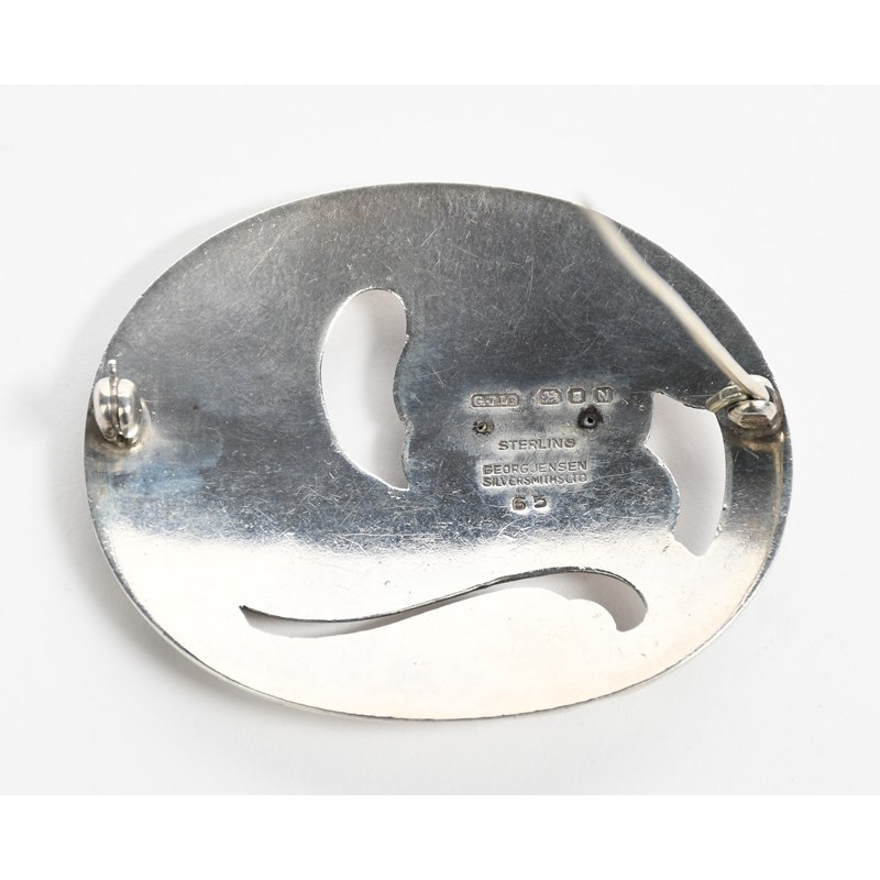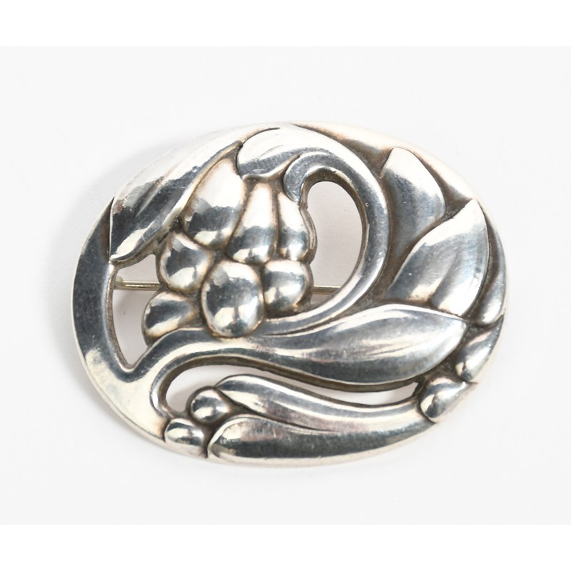 A Georg Jensen silver brooch designed by Georg Jensen, model no.65 oval pierced and cast in low relief with a bell flower stem, stamped factory marks, import hallmarks for London 1948, 5cm. wide