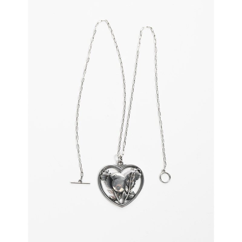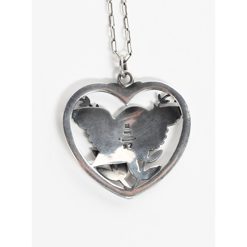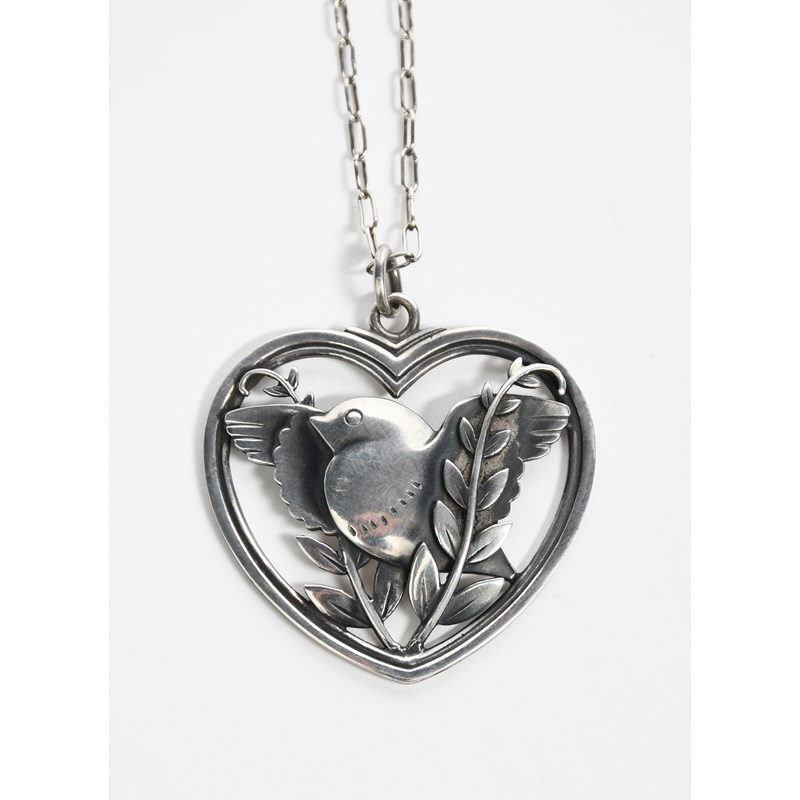 A Georg Jensen silver pendant necklace designed by Arno Malinowski, model no.97, heart-shaped, pierced and cast with a bird flying between two leaves, on link chain, stamped factory marks, 3.7cm. high