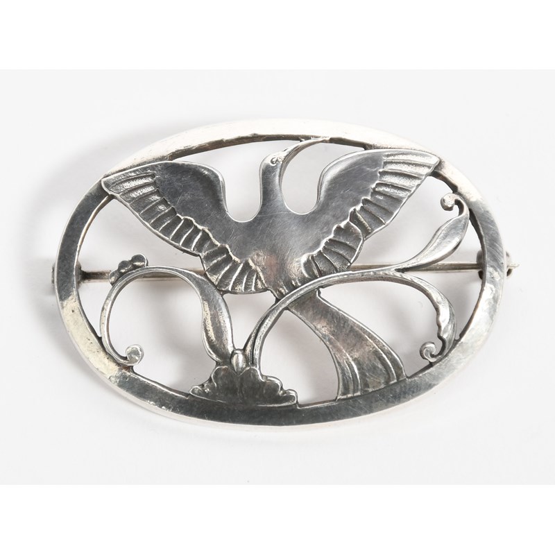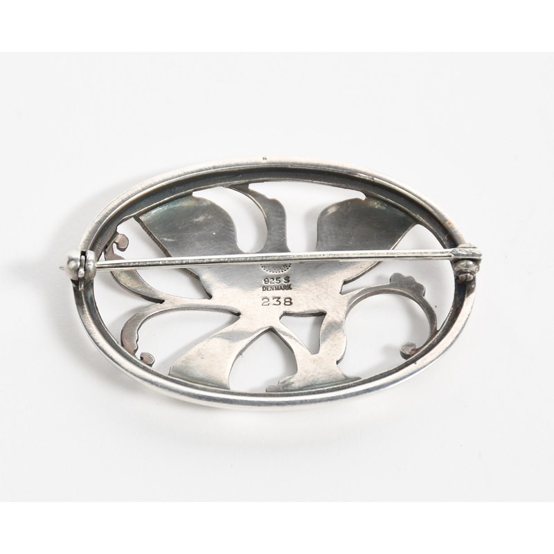 A Georg Jensen silver brooch designed by Arno Malinowski, model no.238, pierced and cast with an exotic bird flying over a large flower, stamped factory marks, 4.2cm. wide.