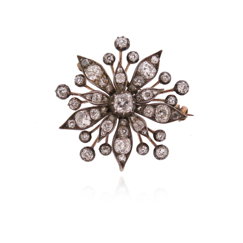 A late Victorian diamond snowflake brooch, set overall with graduated cushion-shaped diamonds in silver and gold, 3cm wide