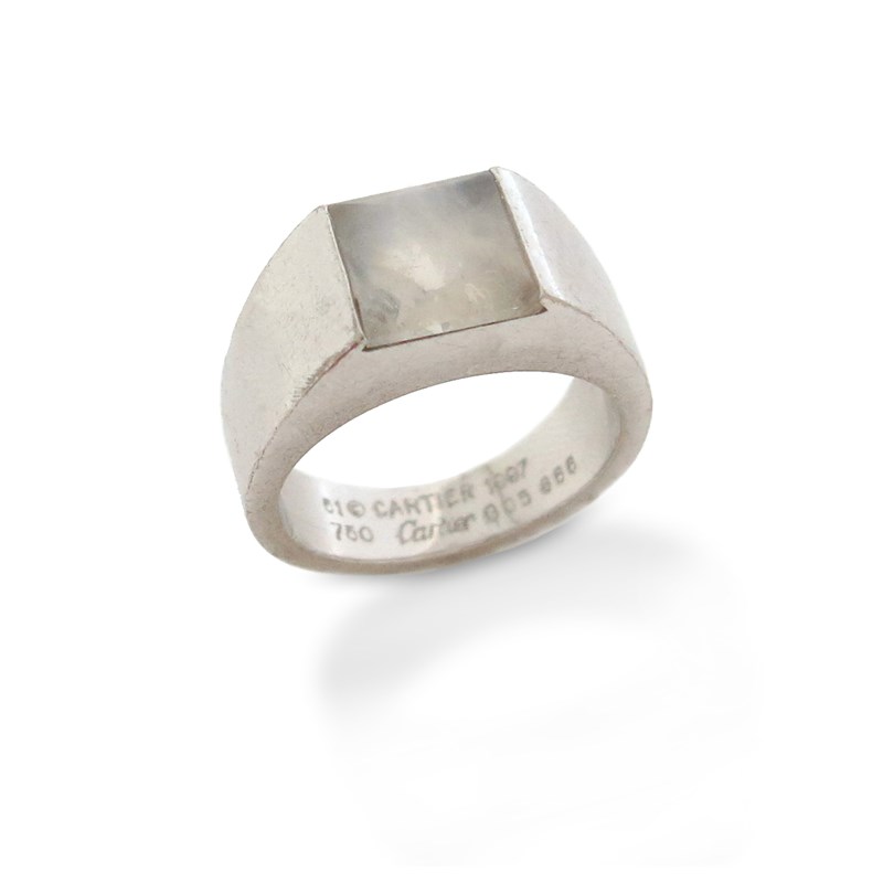 A moonstone and white gold tank ring by Cartier, the buff-top moonstone set in 18ct white gold, signed and dated 1997, numbered 605666, French maker's lozenge to outer shank, size L