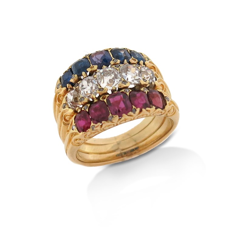 The ring is formed of three rings conjoined but it has been well done and could potentially be returned to its original form. Central sapphire a little more purple than the others, one chipped to reverse a little abrasion overall. Diamonds bright and lively with a couple of small chips, not obvious without magnification. Rubies bright and lively, a little abrasion overall. Settings all good.