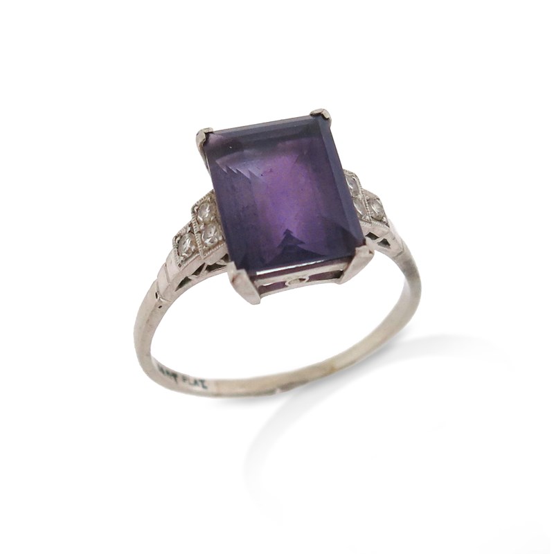 An amethyst and diamond ring, the rectangular-shaped amethyst is set with three single-cut diamonds to each shoulder in platinum and white gold, size S