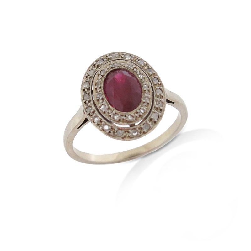 A French ruby and diamond cluster ring, the oval-shaped ruby set within a surround of rose-cut diamonds in white gold, size N