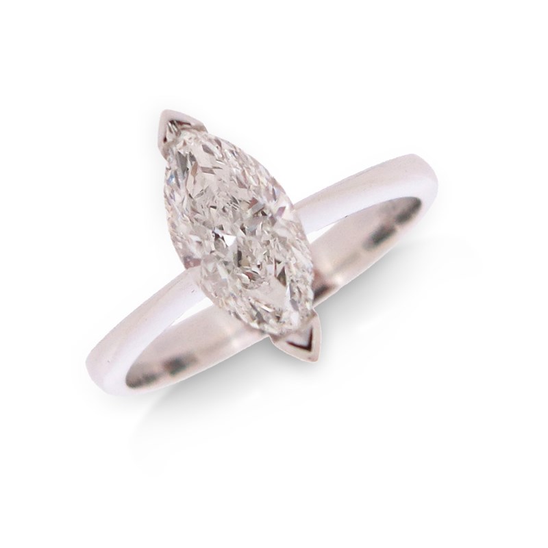 A diamond solitaire ring, the marquise-shaped diamond weighs 1.08cts set in white gold, size L 1/2