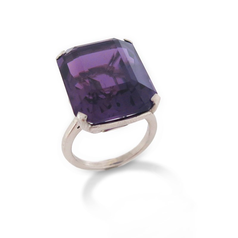 An amethyst solitaire ring, Cartier Monture, the emerald-cut amethyst is claw-set in platinum, signed to inside shank Cartier Monture, rubbed inventory number R7606, size L