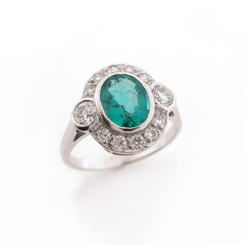 An emerald and diamond cluster ring, the oval shaped emerald flanked with round brilliant-cut diamonds and a further surround of smaller round brilliant-cut diamonds in white gold, size O