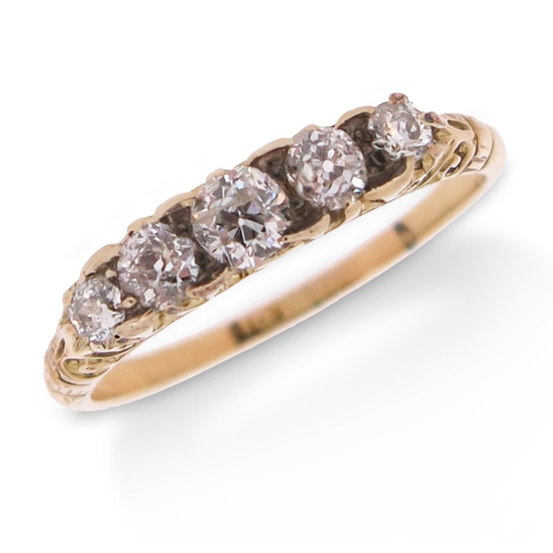 A Victorian diamond five stone ring, set with graduated old circular-cut diamonds in carved and pierced yellow gold shank, size R