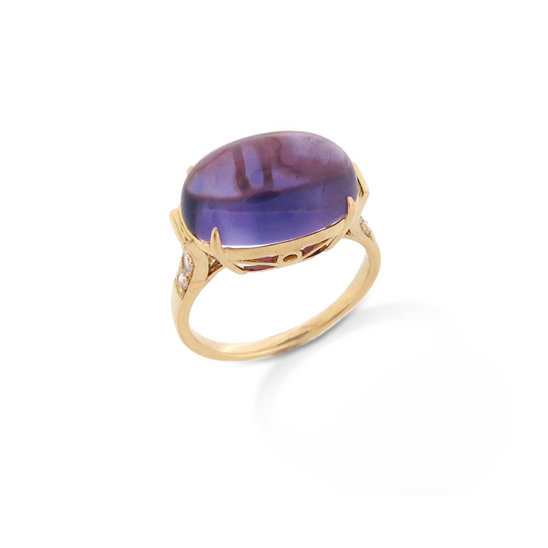 An amethyst and diamond ring, set with an amethyst cabochon, with graduated round brilliant-cut diamonds to the shoulders in gold, size M