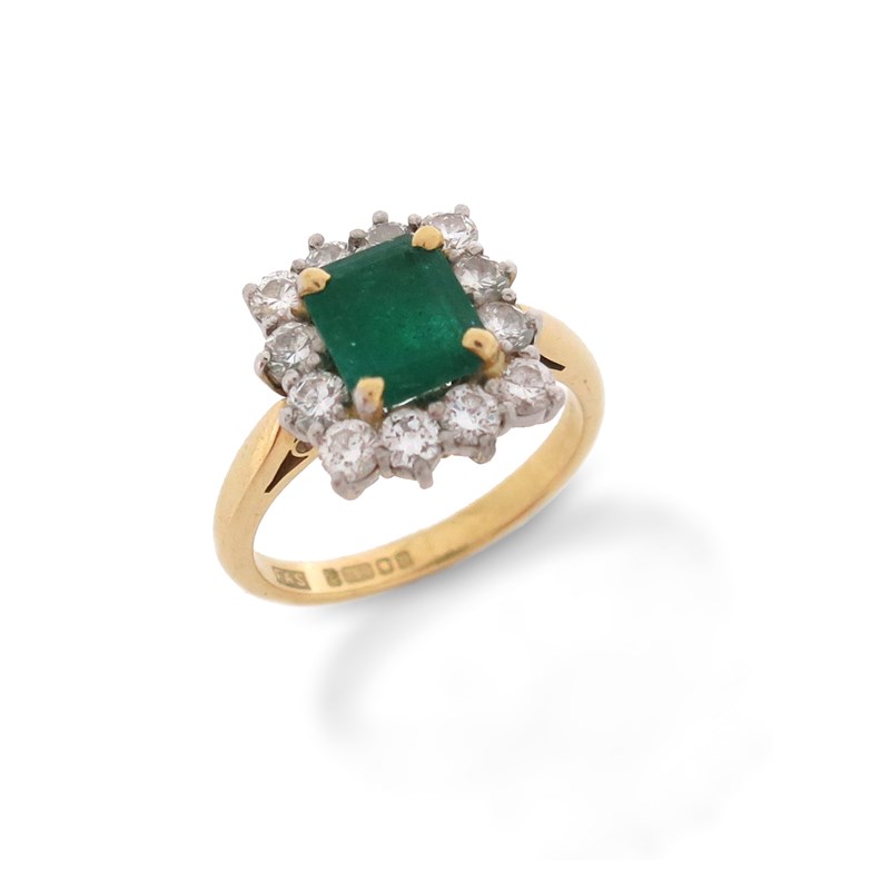 An emerald and diamond cluster ring, the emerald-cut emerald set within a surround of round brilliant-cut diamonds in 18ct yellow gold, London hallmarks for 1995, size K