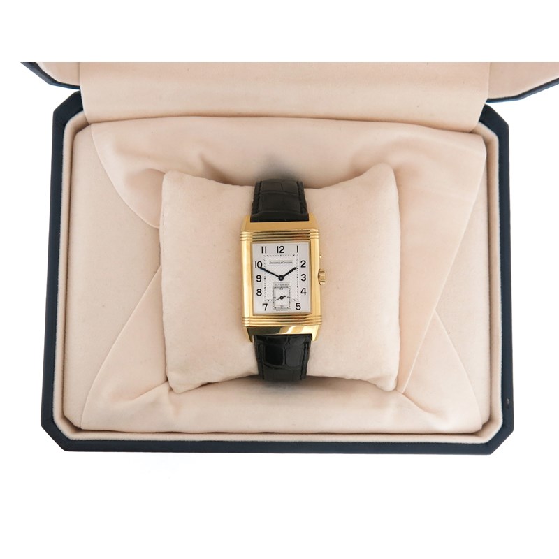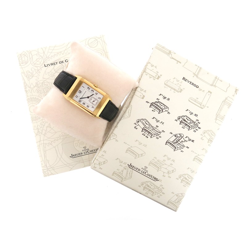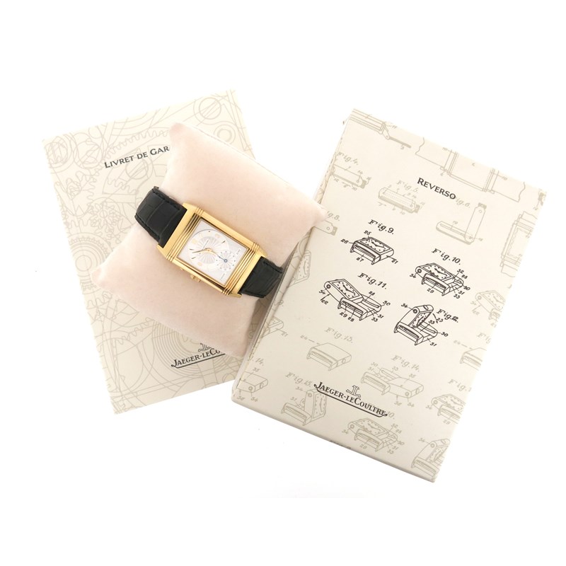 A gentleman's yellow gold Duoface reverso wristwatch by Jaeger LeCoultre, ref 270-1-54, both sides with guilloche decoration to the signed face, different styles of chapter rings and subsidiary seconds dial, manual winding, leather strap with yellow gold Jaeger LeCoultre deployant clasp, case 4.2cm high including lugs, numbered 270154. with box and papers including a fitting instrument