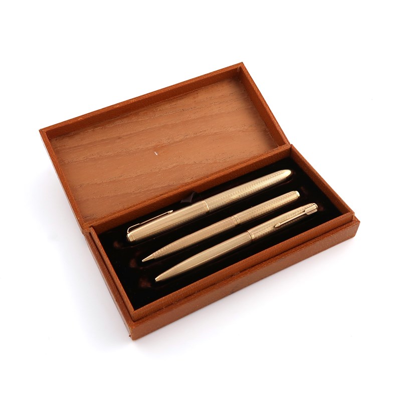 A three-piece 9 carat gold Parker 51 fountain pen, ballpoint pen and pencil set,