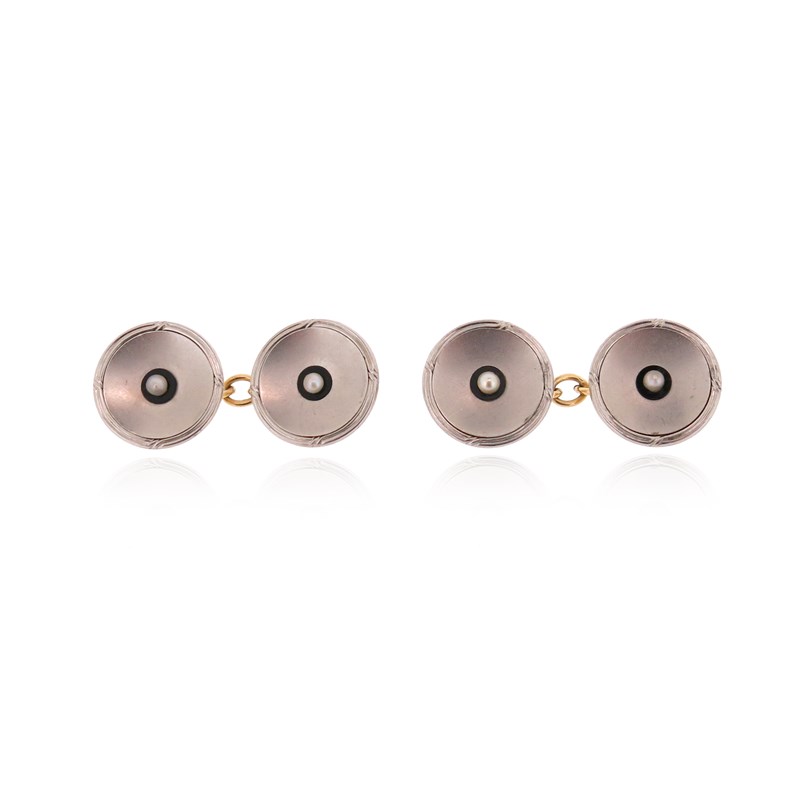 A pair of seed pearl and onyx cufflinks, set in platinum and gold