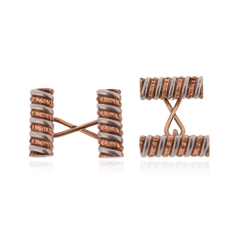A pair of twisted gold cufflinks, in bi-colour engraved and plain gold, each link 18mm long